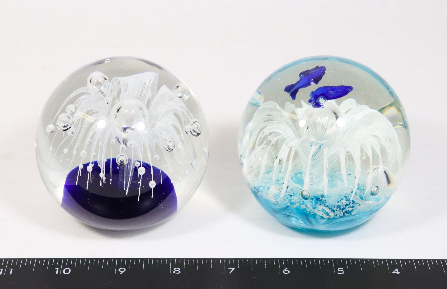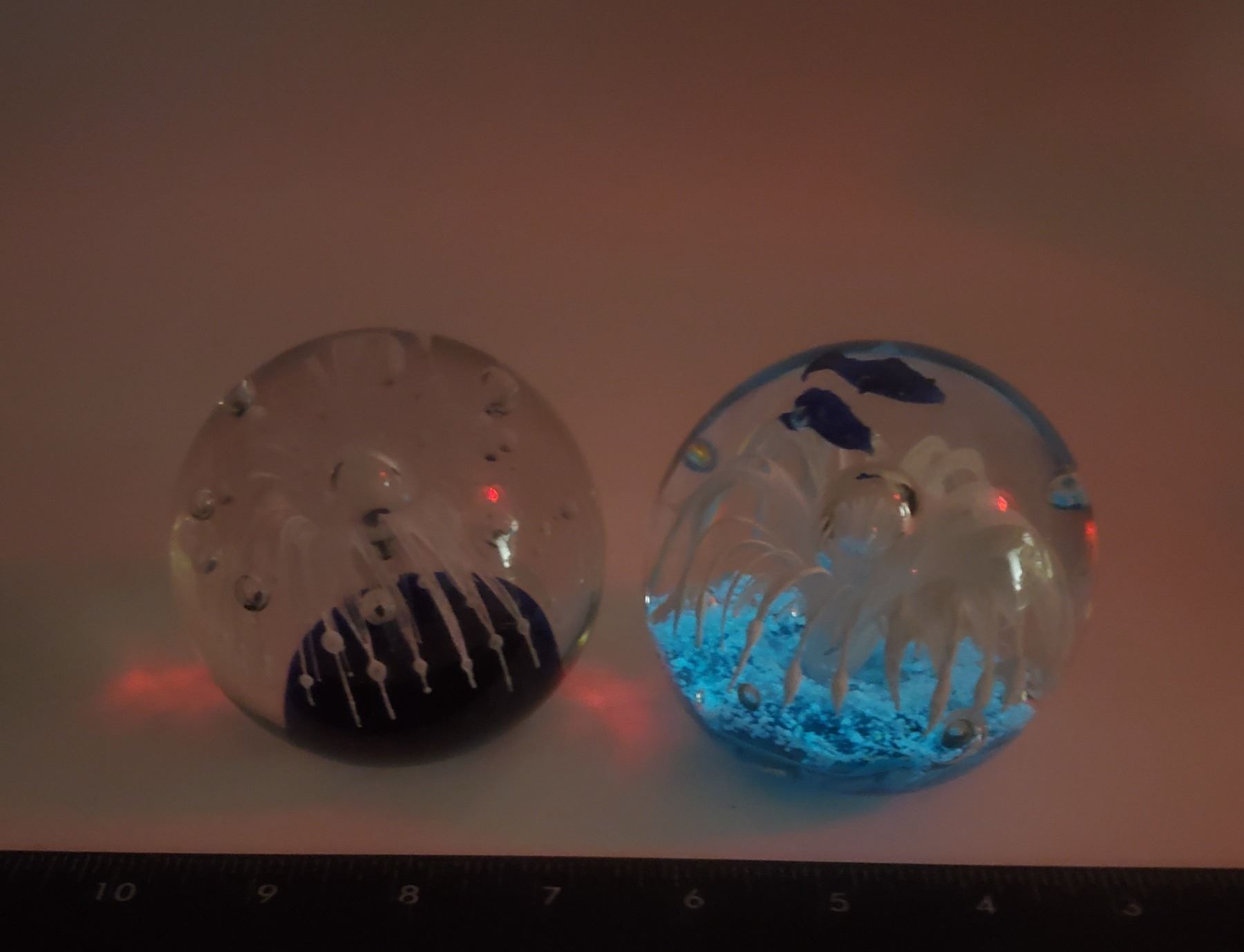 TWO DECORATIVE GLASS PAPERWEIGHTS, ONE GLOWS IN