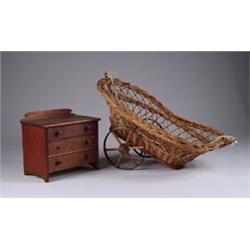 TWO DOLL ACCESSORIES. Lot consists of 1) Two wheeled wicker doll cart. Cart has two wheels with wooden hubs and spokes with metal rims and a wicker basket body. SIZE: 19” l x 11” w. CONDITION: Some breaks to the wicker, otherwise good. 2) Wooden three drawer doll chest. Nice simple design wooden chest has three drawers with turned wooden knobs with a double arch design on the base. SIZE: 8” w x 5” d x 7-1/2” t. CONDITION: One turned knob is missing, otherwise good. 1-2893
