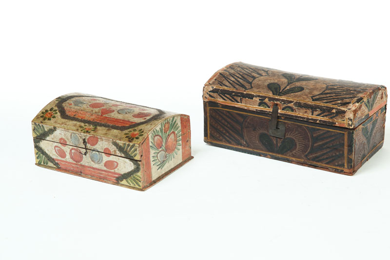 American and European, 2nd half-19th century, various softwoods. Wire staple hinges and original floral paint with sand embellishment, 3 1/2"h. 7 1/2"w., and paper covered with original painted decoration and leather hinges, 4 1/4"h. 10"w. Imperfections.