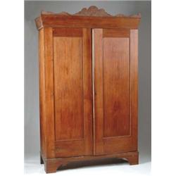 Lot # 1530 TWO DOOR WALNUT WARDROBE. Two large doors open to reveal open interior with bar and two bottom drawers. Bracket base and removable cornice top. SIZE: 80” h x case 51” w x 17-1/2” d. CONDITION: Very good. Carved element on top cornice detached and in two pieces. from long ago break. 9-99017 (1,000-2,000)