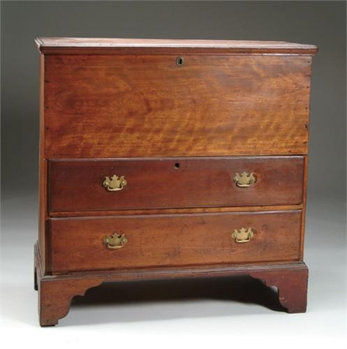 TWO DRAWER CHIPPENDALE BLANKET CHEST. Lift top blanket chest has molded edge, two molded edge dovetailed drawers fitted with replaced brasses. High bracket carved base. SIZE: 41-1/2in. h x 39-1/4in. w x 18in. d. CONDITION: Generally good. One hinge has come loose, bottom bracket molding has missing piece and also missing piece from top right molding. 9-26560