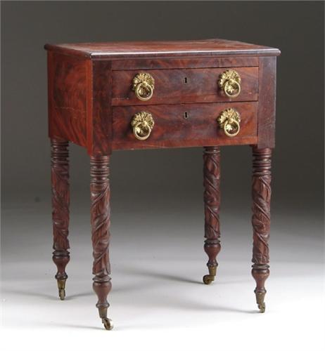 TWO DRAWER FEDERAL MAHOGANY STAND. Molded edge top with two dovetailed drawers in frieze fitted with large rosette and ring handled hardware. One drawer has compartments. Four nicely carved legs with spiral leaf carving ending in brass cup castor feet. SIZE: 29-3/4in. h x 21-1/2in. w x 17-1/4in. d. CONDITION: Top has been reinforced, otherwise very good. 9-26122