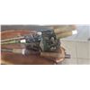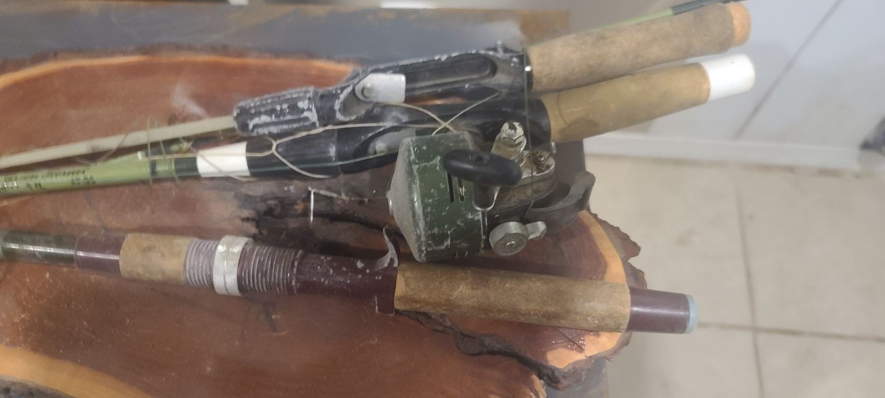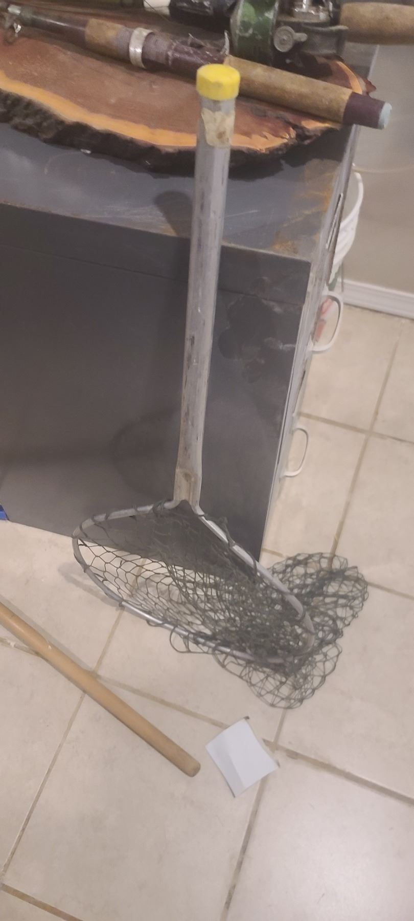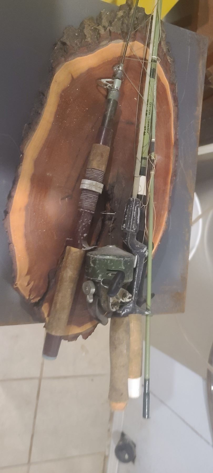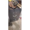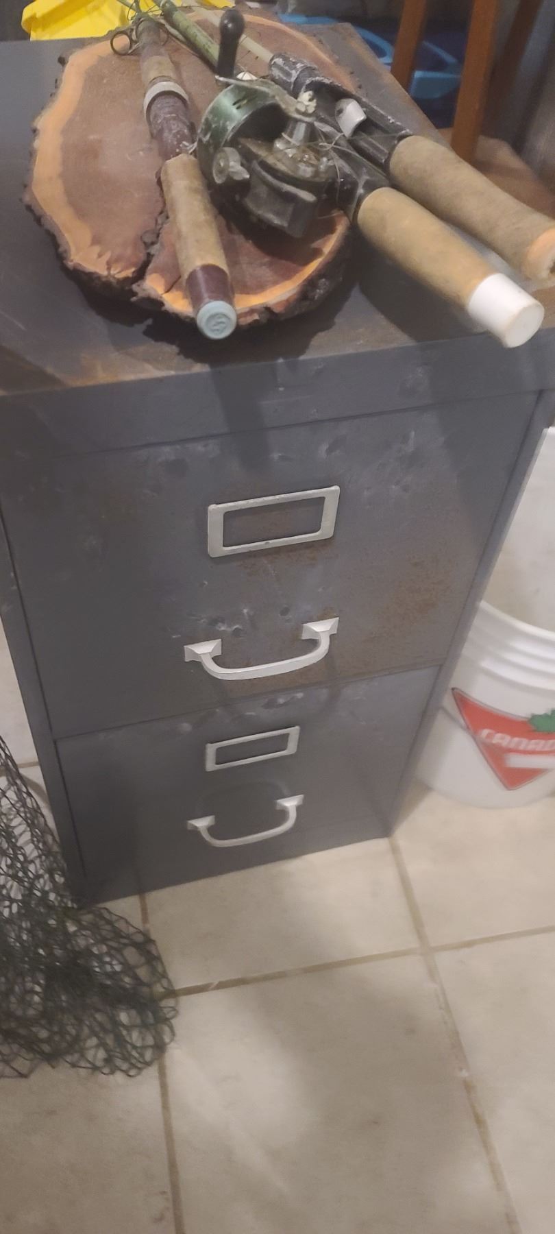 TWO DRAWER FILING CABINET, THREE FISHING RODS, ONE REEL, FISHING NET, AND MOUNTING BOARD