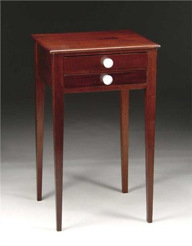 TWO DRAWER HEPPLEWHITE MAHOGANY STAND. Original thin one board overhanging top with two drawer having opalescent glass pulls. Raised on square tapered legs. Eastern Massachusetts, circa 1800. SIZE: 28” h x top 15-1/2” d x 16-1/2” w. CONDITION: Very good. 9-26668