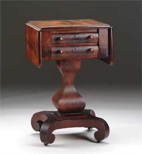 TWO DRAWER MAHOGANY EMPIRE WORK TABLE. Drop leaf top over two drawers fitted with wood knobs, one having segmented drawer supported by a shaped center column with quatrefoil foot base. SIZE: 28in. h x 17in. d x 16in. (closed); 34in. (open). CONDITION: Some veneer loss to feet area, otherwise good. 9-26188