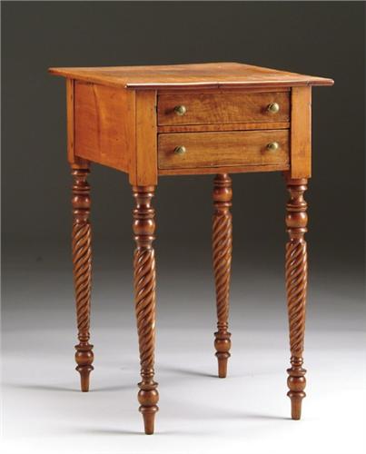 TWO DRAWER SHERATON STAND. Square top with two dovetailed drawers in frieze, each fitted with two replaced brass knobs. All supported by four nicely spiral carved and turned legs. Curly maple top and frieze. Walnut drawers. SIZE: 28-3/4in. h x top 18in. x 20-1/2in.. CONDITION: Refinished, reinforcement made to top, otherwise good. 9-26133