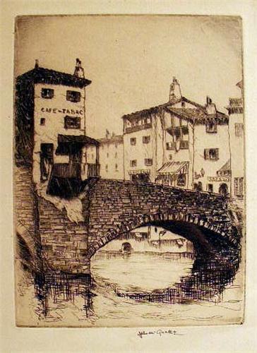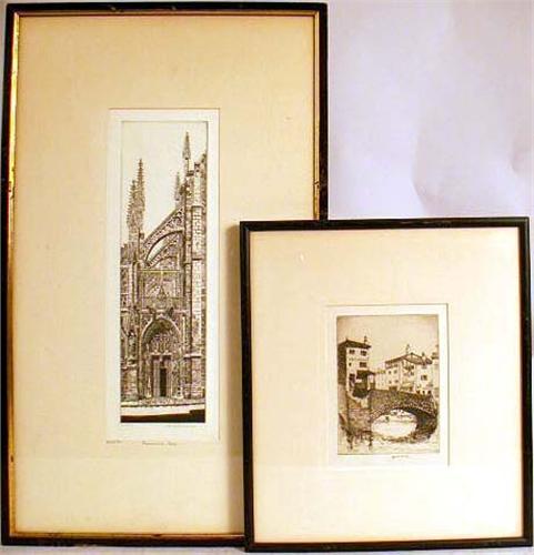 One titled "Louvier`s Lane", bears signature John Taylor Adams, the other titled "House on the Bridge", bears signature John McGrath. 13"h x 4"w and 6 1/4"h x 4 3/4"w, respectively. Provenance of latter: J.J. Gillespie Company, Pittsburgh, PA.