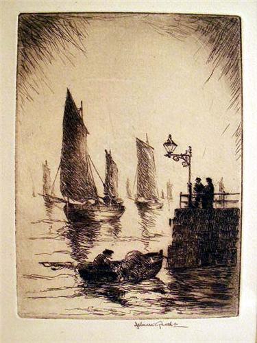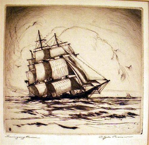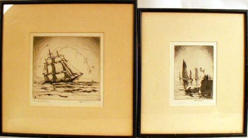 The first titled "Retours des Pescheurs", bears signature John McGrath, the other titled "Swinging Home", bears signature Clyde Cromer. Each approximately 7 1/2"h x 7 1/2"w. Provenance: Each from J.J. Gillespie Company, Pittsburgh, PA.