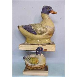 TWO DUCK PIPSQUEAKS. Papier-mache handpainted with blue heads and tails. The smaller is on a bask…