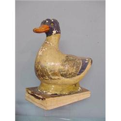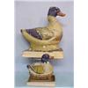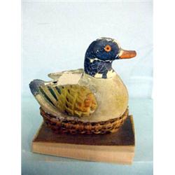 TWO DUCK PIPSQUEAKS. Papier-mache handpainted with blue heads and tails. The smaller is on a basketry nest and has movable wings. Replaced bellows work. 3 3/4"h. The other has a gold and silver breast. Cloth bellows torn. 6 1/2"h. Both have damage.
