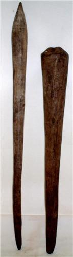 TWO EARLY FIGHTING CLUBS, of hardwood with flaring heads above a tapering shaft, weathered and encrusted, Queensland, 54 - 64cm (2) Provenance: Ex-private collection USA, originally acquired by an English family during the 1920s-1930s who are considered to have been associated with Tyrrell's Museum of Castlereagh Street, Sydney, Australia during 1929