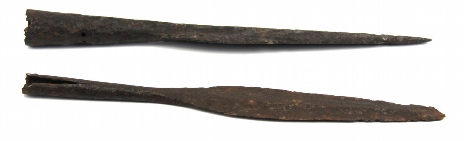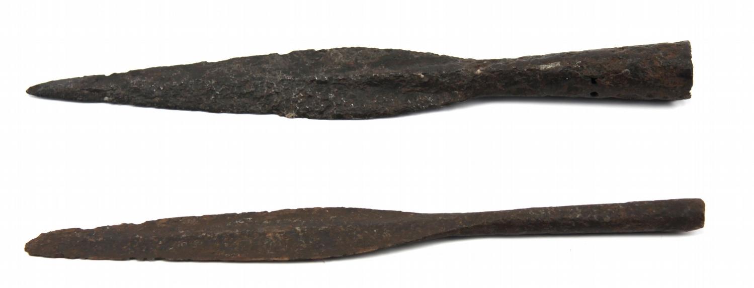 Two spearheads from the early middle ages, Viking and Saxon like designs. The first measures 11.5 inches overall, narrow leaf-shaped profile, just over an inch at the widest, with flat central rib and split-socket attachment design. Point is chipped off. The second measures 12 inches overall, with wider leaf profile, 1.5 inch at the widest, very pronounces central rib, and socket with rivet hole attachment design. Both items are in excavated condition, cleaned and very well conserved. Reputedly unearthed in the same area of Germany.