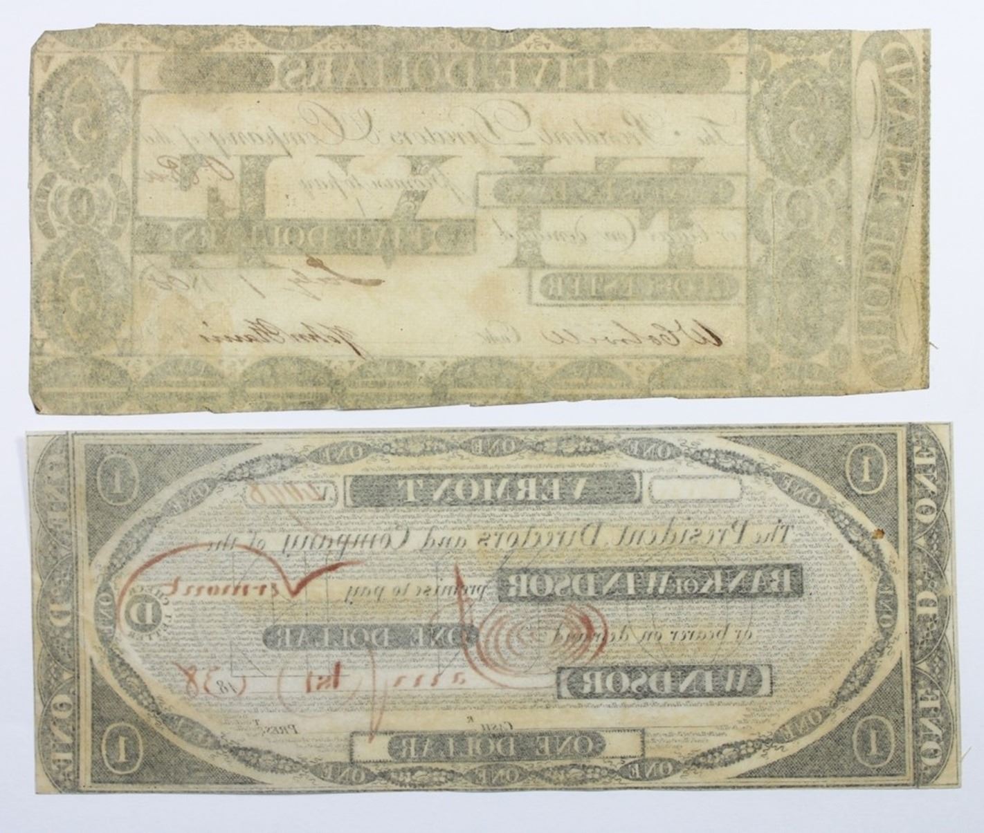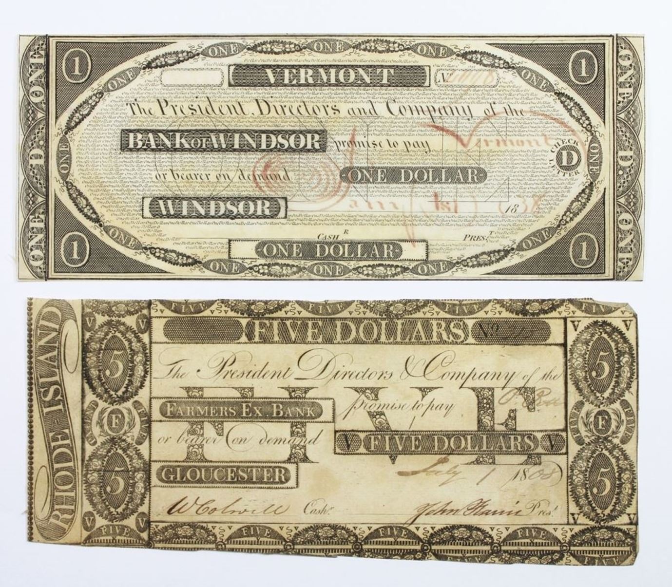 BANK OF WINDSOR, VT, RI FARMERS EXCHANGE. BOTH NICE XF OR BETTER. ESTIMATE: $150-$200