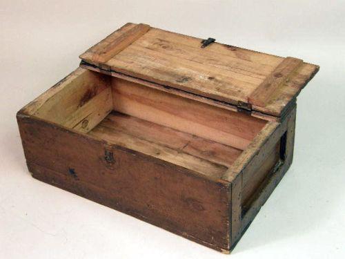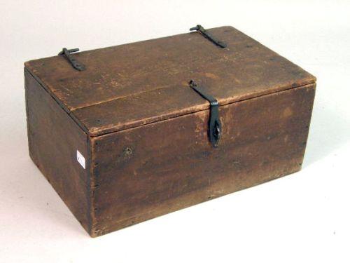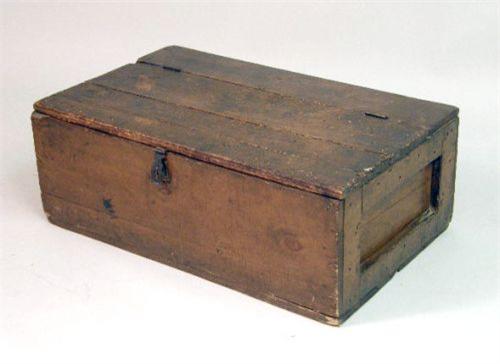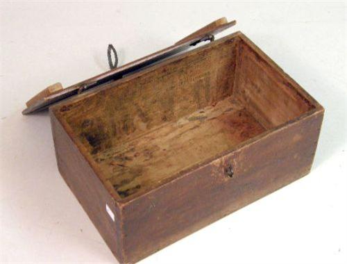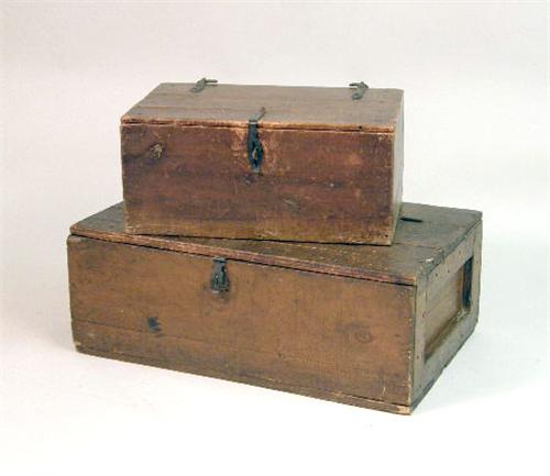 Interior of the smaller lined with an 1883 copy of the Philadelphia Record, the larger a quartermaster`s chest. 10 1/2"h x 23"w x 14 1/4"d and 12 1/2"h x 32 1/4"w x 19 1/2"d, respectively