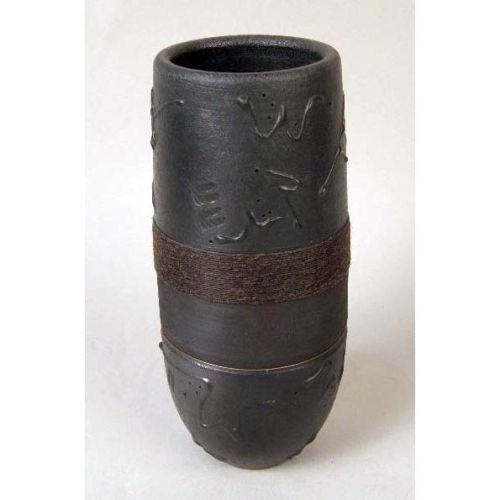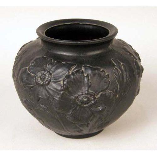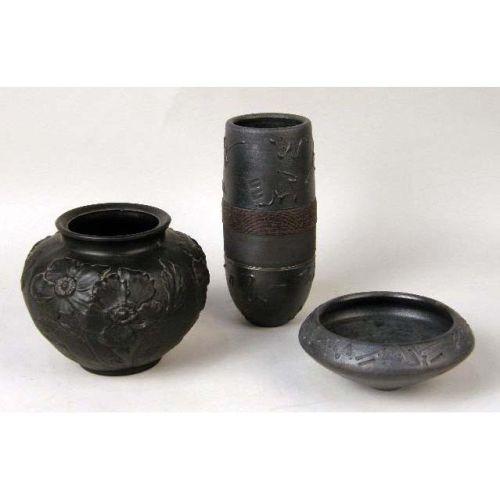 TWO EARTHENWARE VESSELS<BR><BR>Comprising, a shallow bowl and a cylindrical vase. Together with an amethyst glass floral-decorated vase, 8"h, 3 pieces