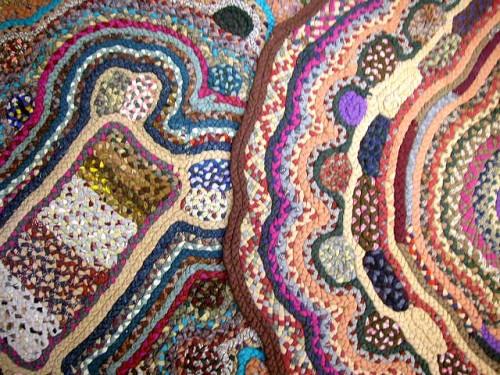 TWO ELLIPTICAL RAG RUGS; Each with scalloped sides, one centering a stylized dog, the other a bone Largest 6'w x 5'l