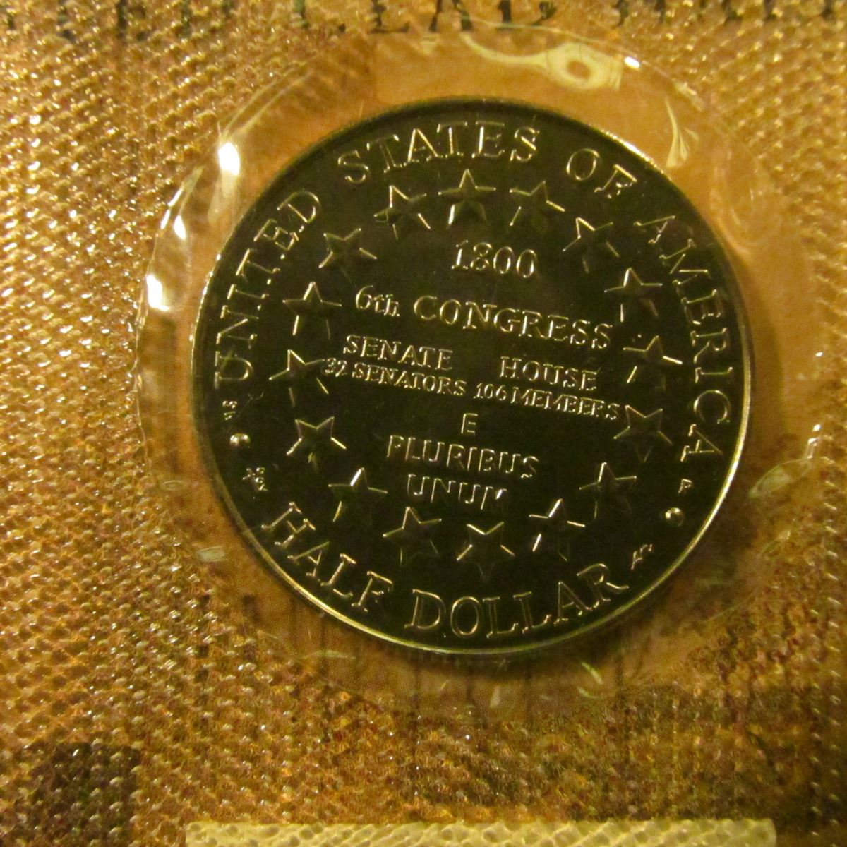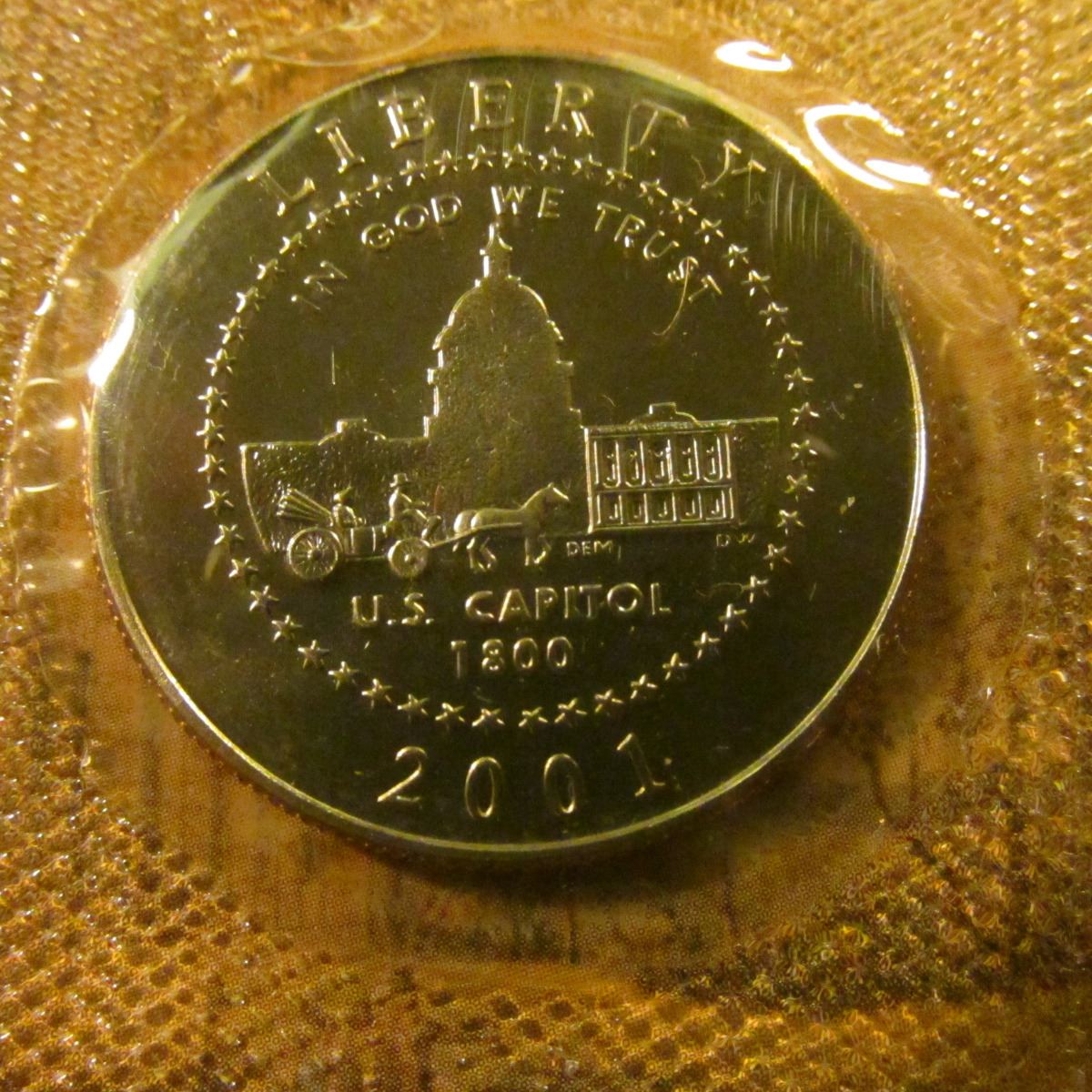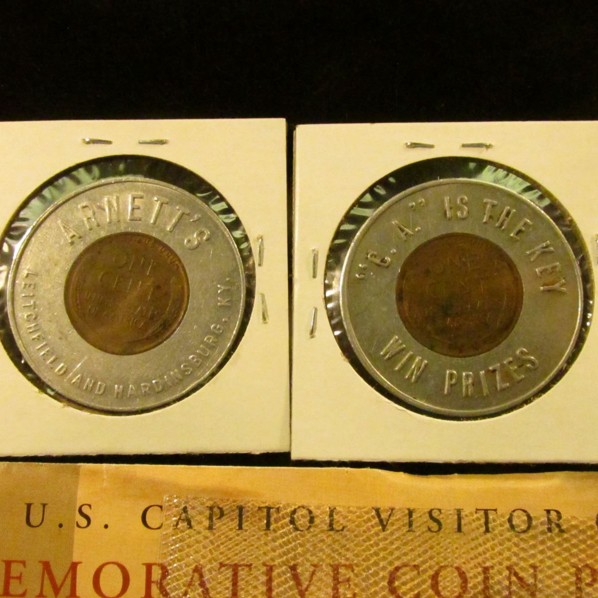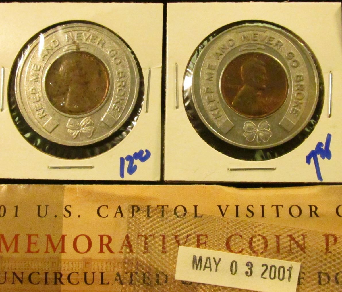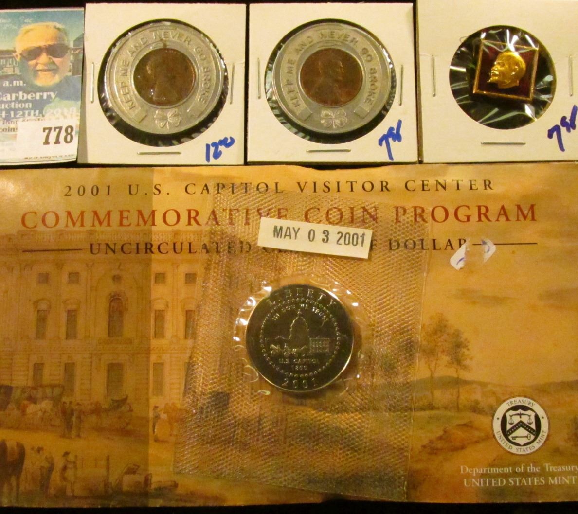 TWO ENCASED GOOD LUCK PENNY TOKENS/ ADVERTISING PIECES, PINBACK WITH LENIN ON IT, AND 2001 CAPITAL VISITOR CENTER COMMEMORATIVE HALF DOLLAR