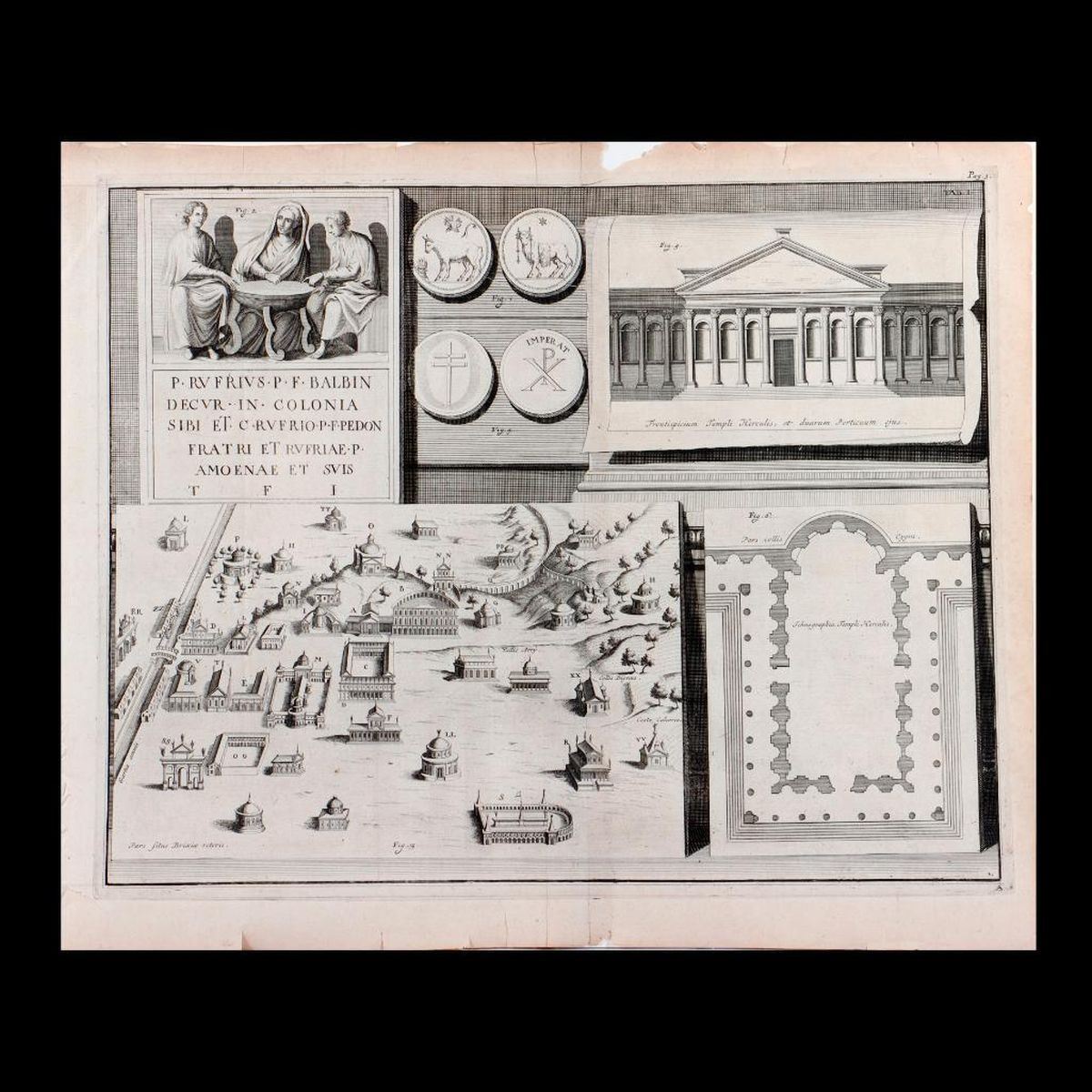 1. Scenes of a colony, showing three plans/aspects, including the Temple of Hercules. 15 1/2in. x 18 3/4in. Condition: Overall good; toning; fold at center; light spotting at top and right margin; numerous edge tears, and tear/loss at top margin. 2. "Tabula I. Laurentini." Plan of a villa and gardens, fold-out illustration. 12 1/2in. x 18in. Condition: Overall good; half of left margin missing; at least six vertical and three horizontal folds; edge tears; toning, edge soiling.