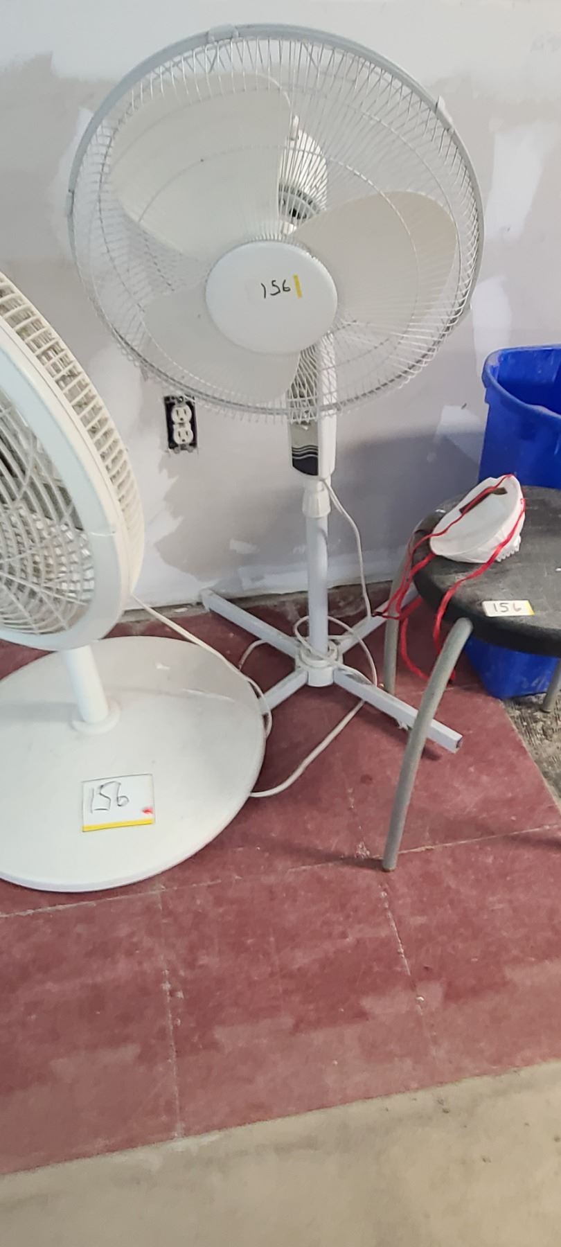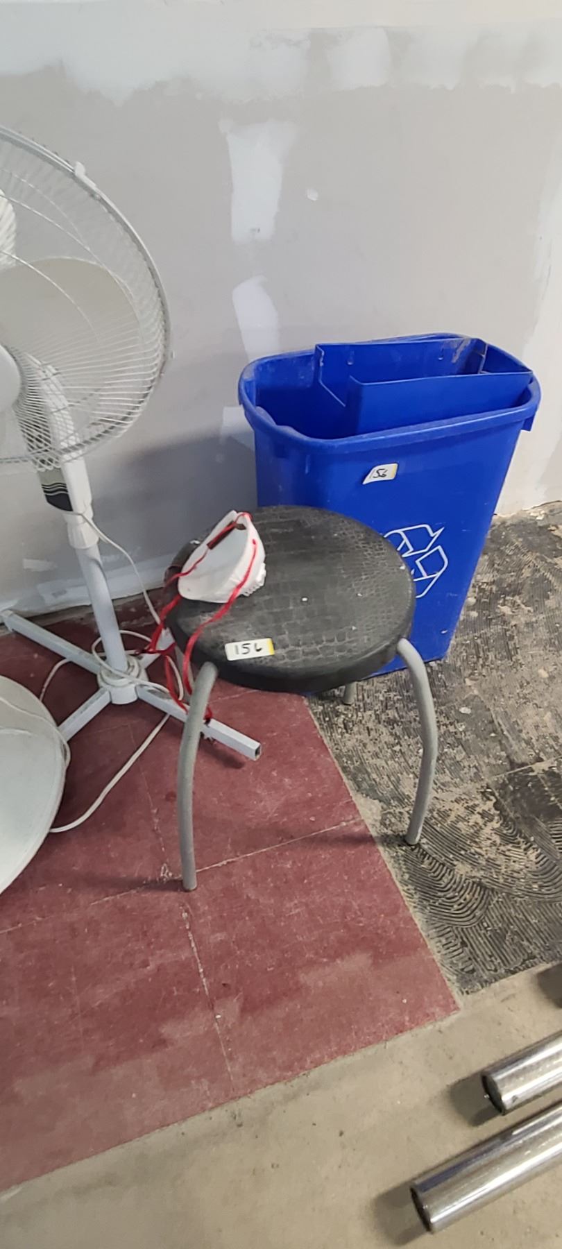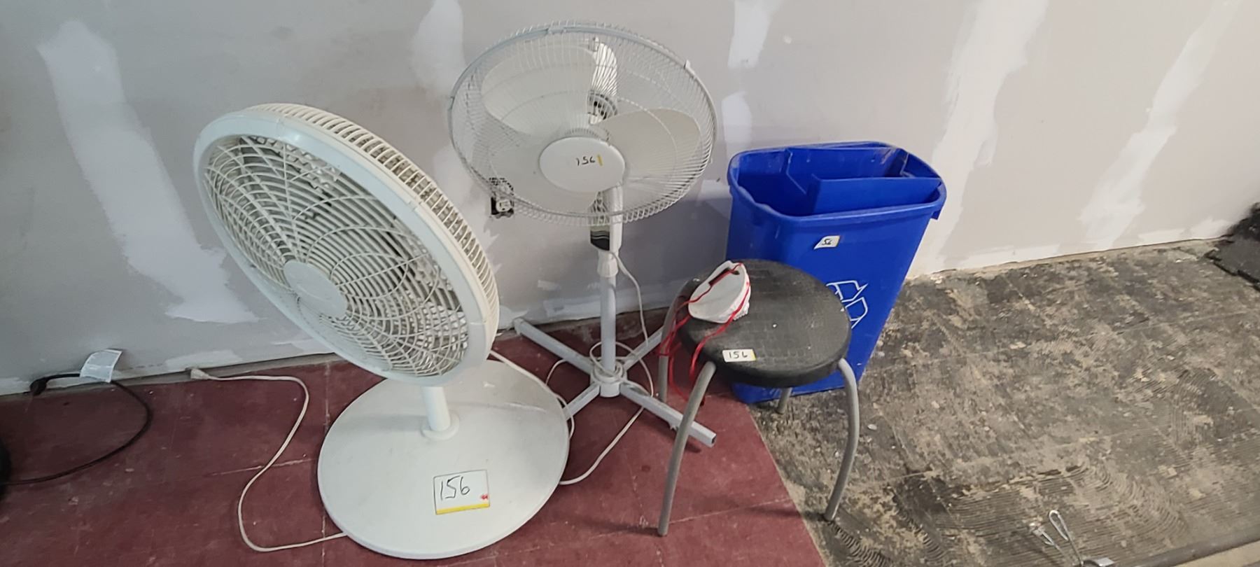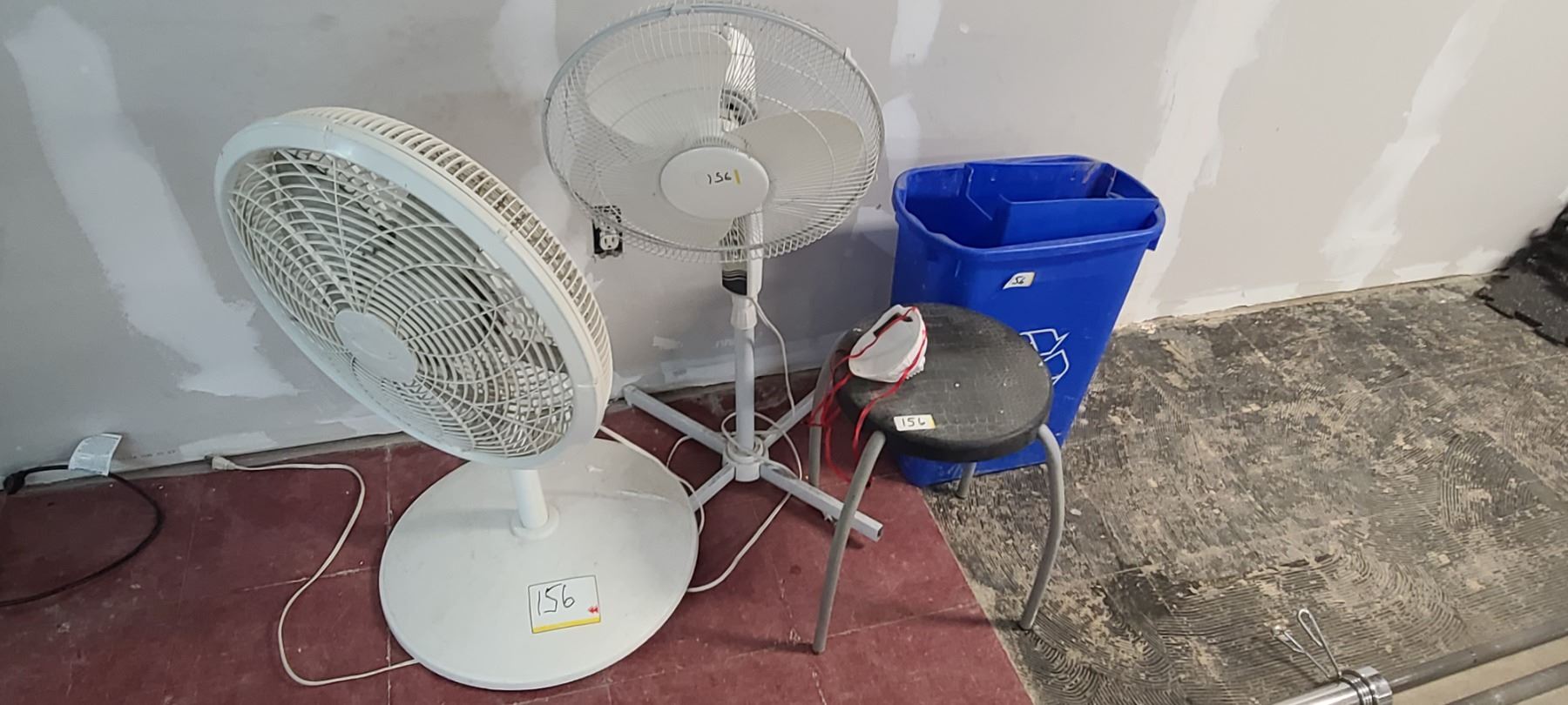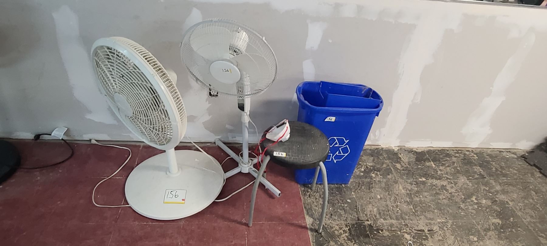 TWO FANS, TWO STOOLS AND RECYCLING CAN