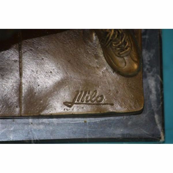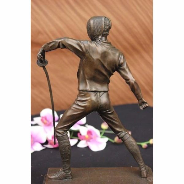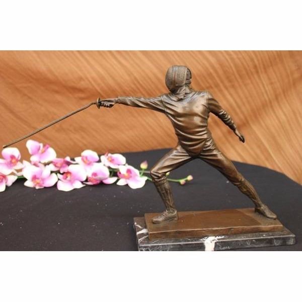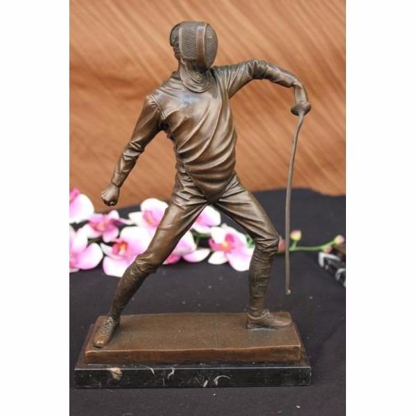 With a quick forward lunge the fencer hopes to hit is target lame. On the defense a counter attack is proposed with a stop hit to the attackers saber. Weather this is an Assault or a bout these two fencers sure do seem to be giving it their all. These sculptures speak volumes of motion, both sculptures are impressively detailed. On both fencing masks you can see the detailed mesh that protects their faces and the neck guards fall with movement. Underneath the masks the men both sport sweaty hair dos with heavy hair. Even the lames have lines of movement; you can see the creasing of the clothes in the areas of extension, look at the legs and the extended arms. Each player is wearing a different pair of socks. The sculpture on the right has high socks with a thick band at the top but a thick weaves going down his legs in stripes. As the sculpture on the left wears high socks with a thick band and a weaves pattern all around the socks. The shoes are remarkable showing the laces weaving in and out of every hole. Their hands are gripped around their sabers and their knuckles are highlighted with a gold patina to show the strength they hold them with. These beautiful classy sculptures come in a pair and are signed by the artist Milo. They are both set atop a black marble base, are solid bronze, and 100% handmade. These sculptures portray the wonderful sport of fencing in a refined manner. This is a great gift for the fencer in your life or just for the sports lover in your life. These sculptures are sure to add a touch of class to any space! Condition: Both sculpture are in perfect condition. Bronze Dimensions with Marble Base :Height 11" x Width 18" 2nd Sculpture: height 12" X 12" each Marble size: 9 1/2" X 4" Height without base:11" Each statue Weight : 8 LBS Inventory : 23B3758032
