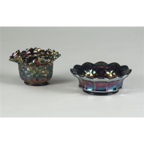 Two Fenton amethyst carnival glass small bowls. The first one measures 6'' x 2.25'', grape pattern, thumb print sides, hallmarked Fenton on underside. The second is a small basket shaped bowl, marked Fenton on underside, 5'' x 3''.