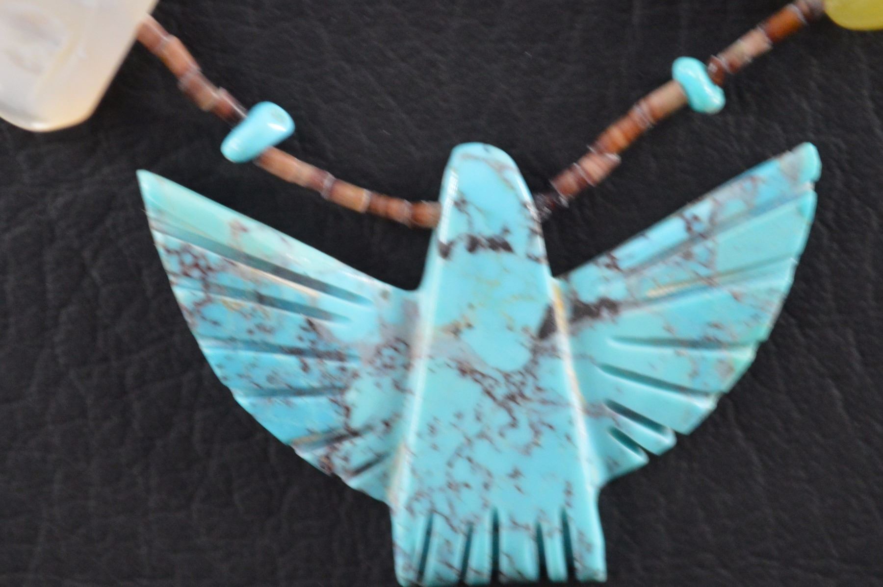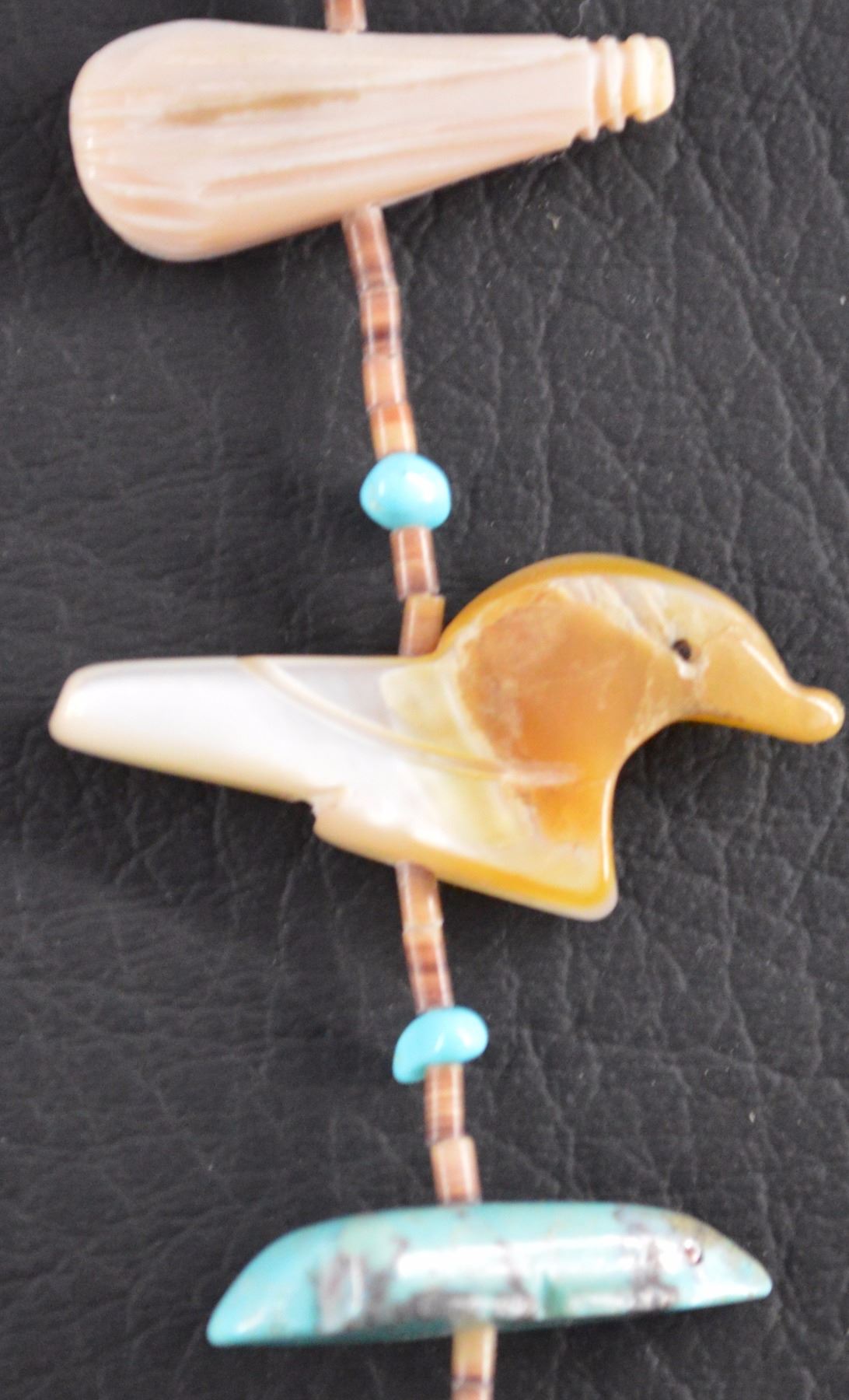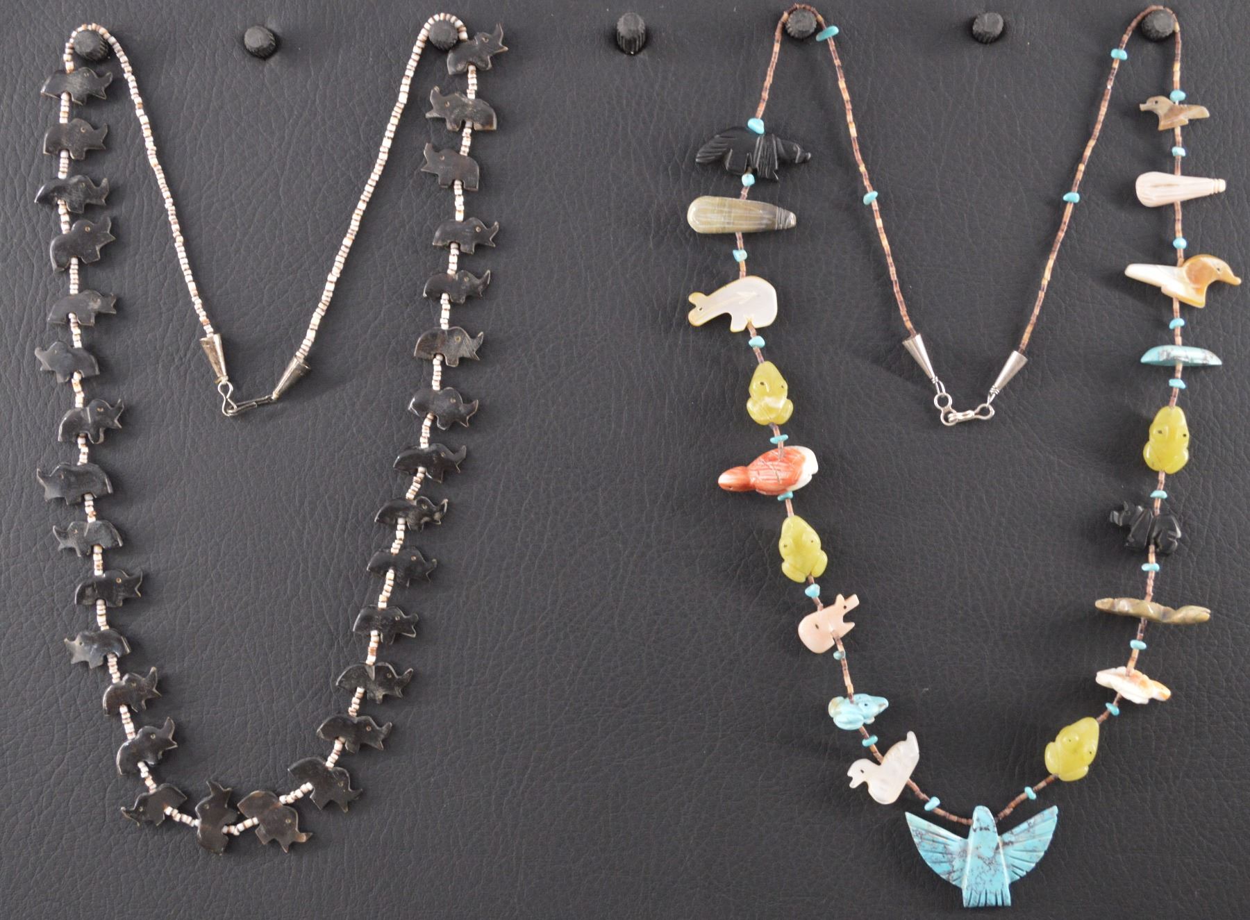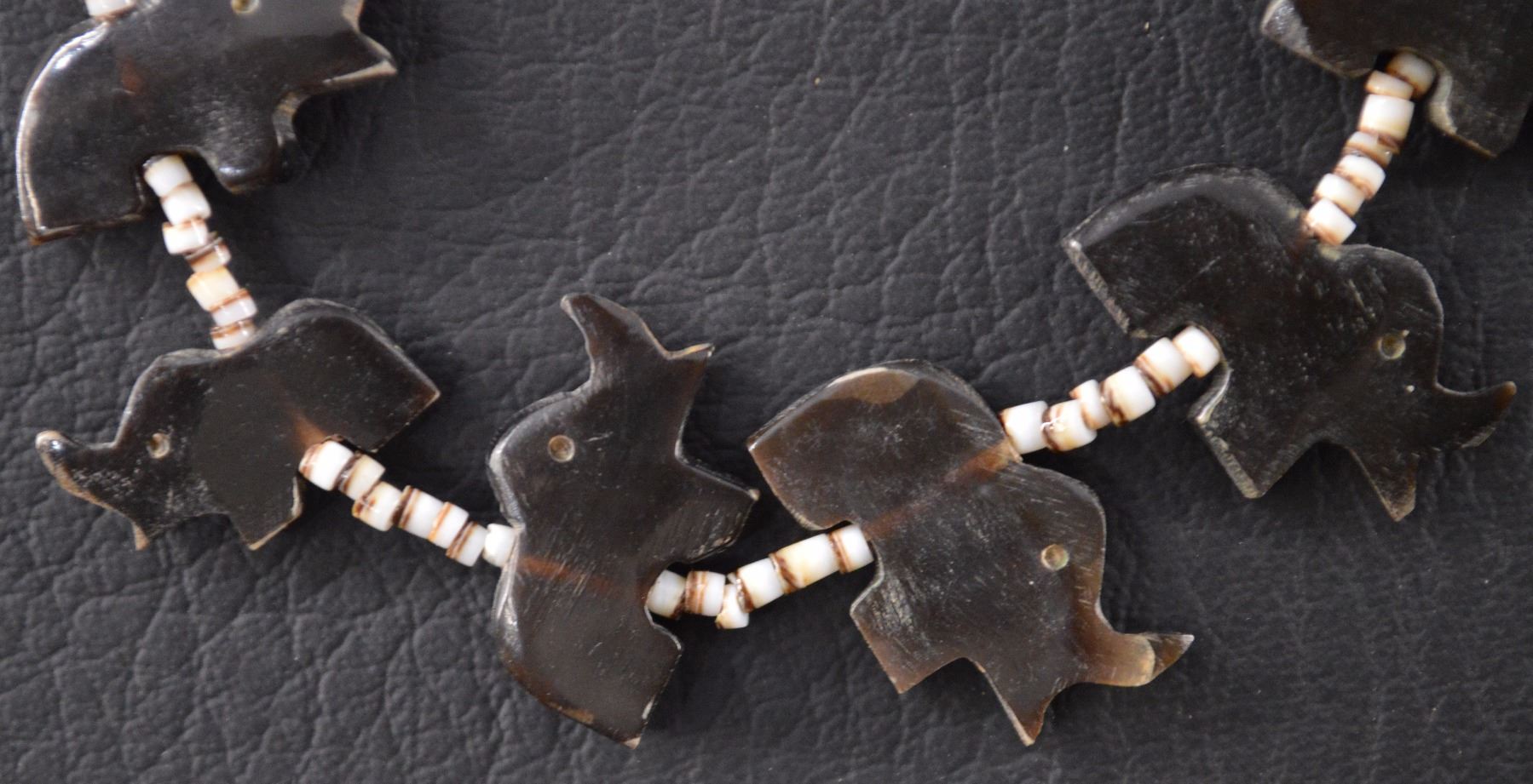 1980's. Single strand of shell heishi with carved elephant's, 28" long. Single strand of heishi with carved animal fetishes, 30" long.