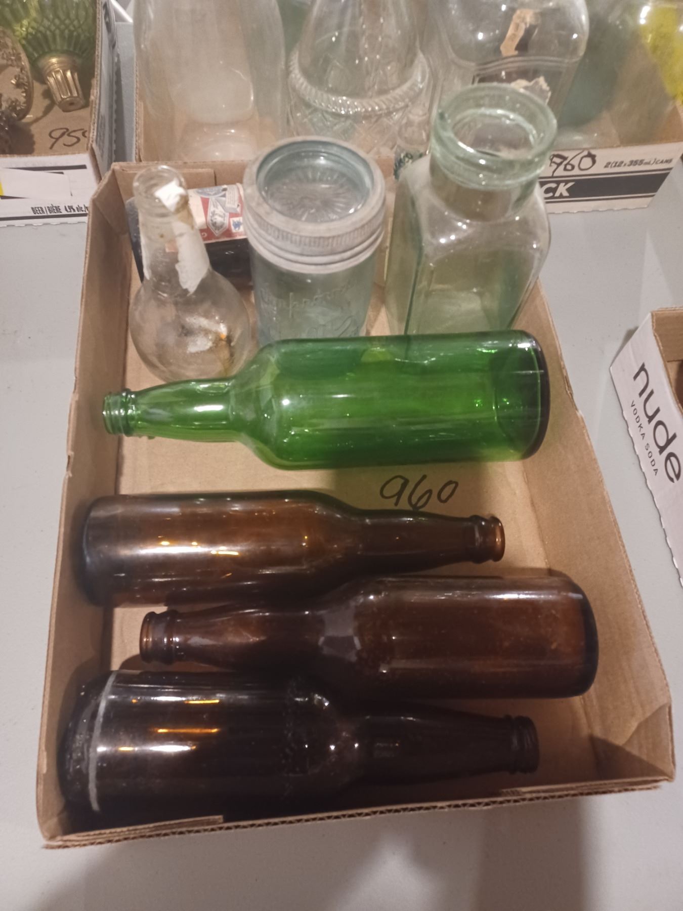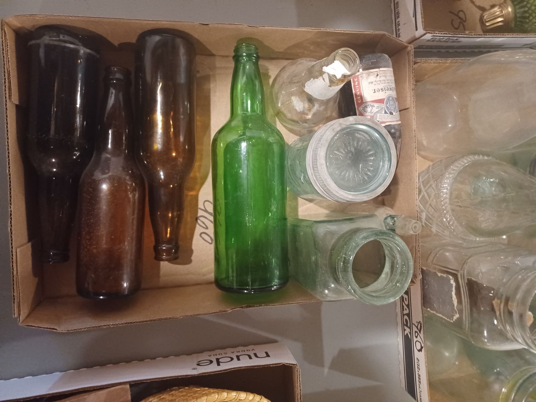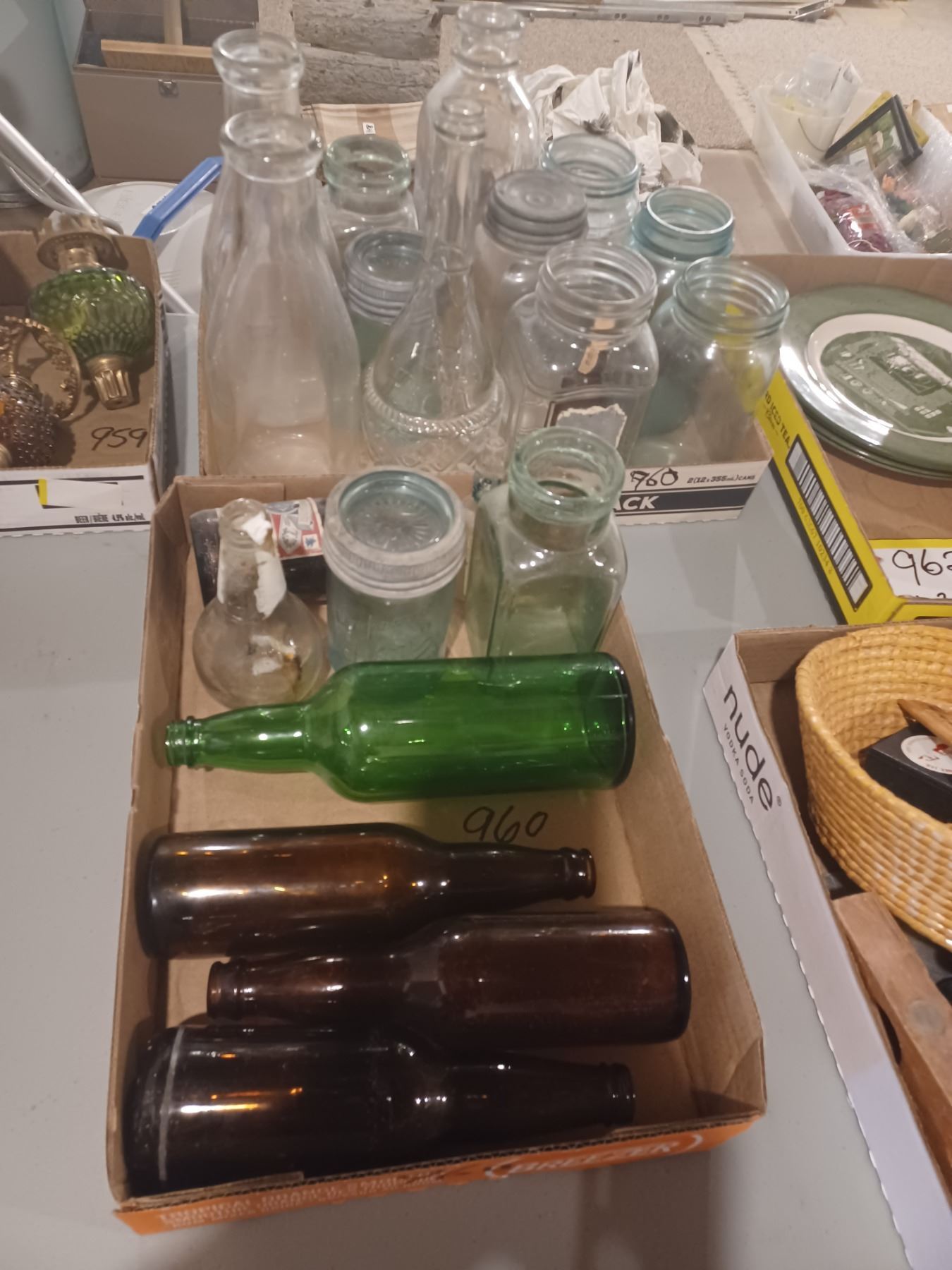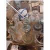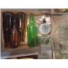 TWO FLATS OF GLASS BOTTLES AND JARS - VARIOUS SIZES AND COLOURS