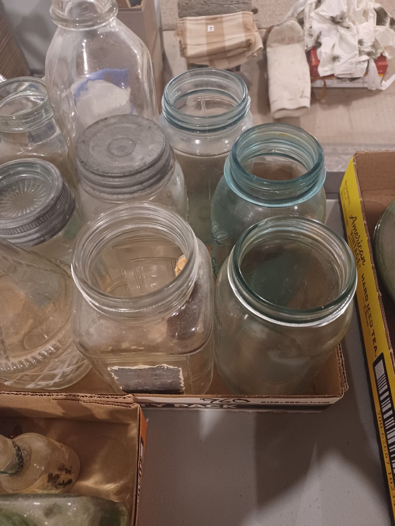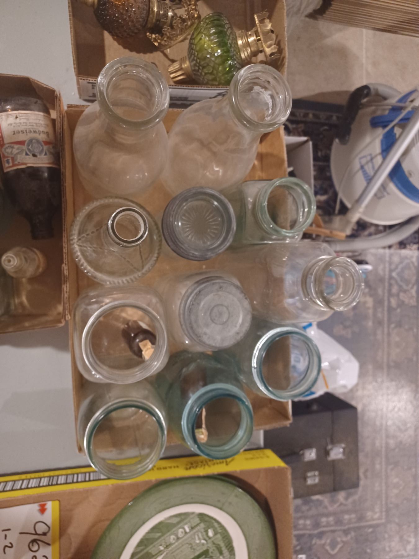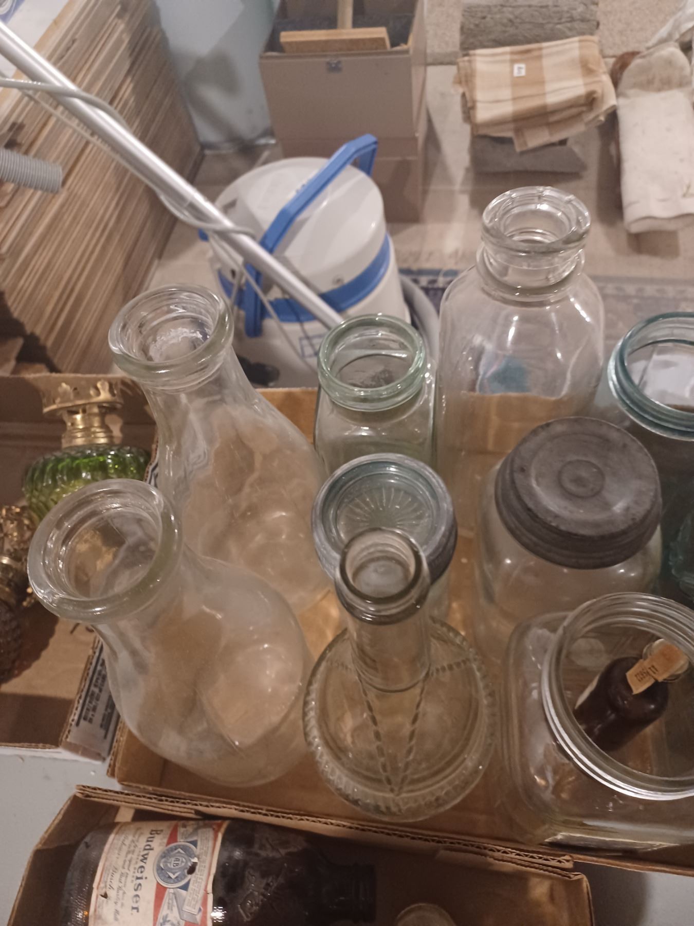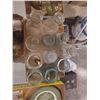 TWO FLATS OF GLASS BOTTLES AND JARS - VARIOUS SIZES AND COLOURS
