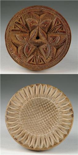 TWO FLORAL BUTTER PRINTS. 1) One piece round sunflower. SIZE: 4in. dia x 3in. with handle. CONDITION: Tight crack at side, otherwise very good. 2) Round with three opposing stylized flowers. SIZE: 3-3/4in. dia x 4-1/4in. with handle. CONDITION: Very good. 9-25365; 25373