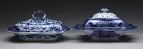 TWO FLOW BLUE COVERED ENTRÉE BOWLS.  One by Cauldon in the Bendick pattern.  Other is by Wood & Sons in the Vienna pattern.  SIZE:  Both are approximately 11-1/2” l x 5-1/2” h.  CONDITION:  Very good.  9-26811