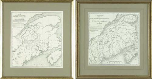 TWO FRAMED MAPS. 1) “Map of the Northern Part of the State of Maine and of the Adjacent British Provinces by S. L. Dashiell, Washington 1830”. Printed by W. J. Stone, So. Wash. Black and white map with some color highlighting to borders. Housed in a gilt frame with olive green matte. SIGHT SIZE: 17” x 16”. CONDITION: Fold marks, very good. 2) “Extract From a Map of the British and French Dominions in North America by JNO Mitchell”. Printer by W. J. Stone, So. Wash. Black and white map. Housed in a decorative gild frame with olive matte having gold lined border. SIGHT SIZE: 13-3/4” x 13-1/4”. CONDITION: Very good. 9-27203