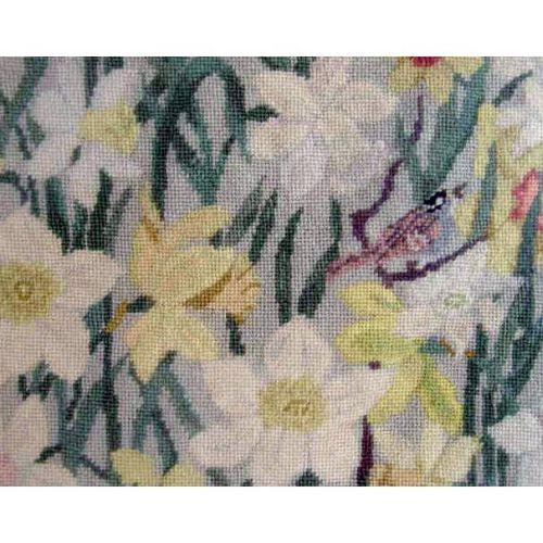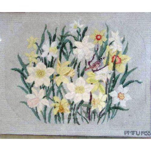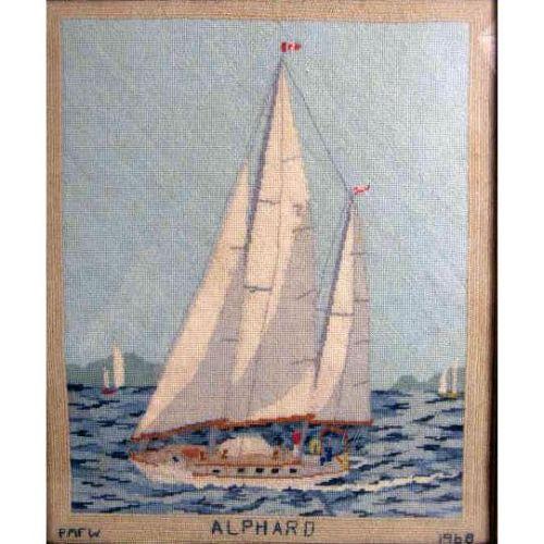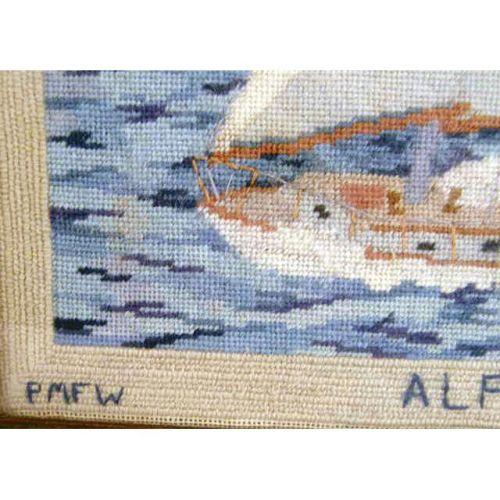 TWO FRAMED NEEDLEPOINTS<BR><BR>One depicting a schooner, titled "Alphard," Together with another needlepoint depicting daffodils, 15"h x 12-1/2"w and 15"h x 19"w