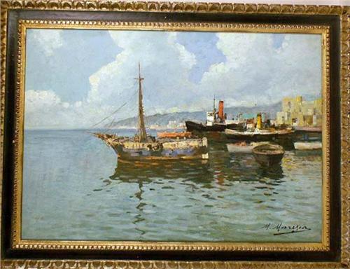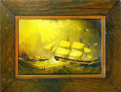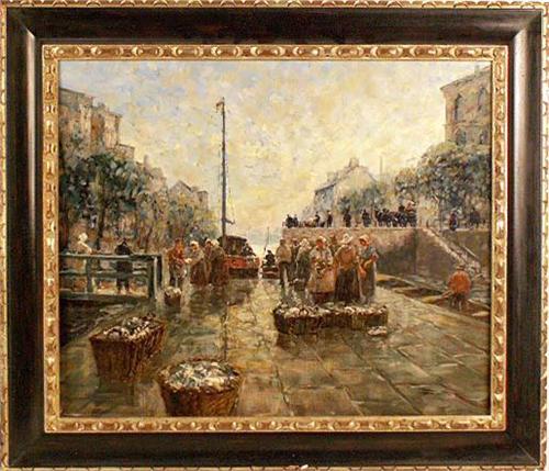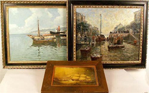 The first depicting market place at the docks, 19"h x 23"w, the second of a harbor, 19"h x 27"w. Together with a print of a ship, 9"h x 13"w 3 pieces