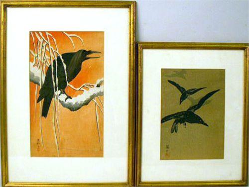 Japanese, each depicting ravens, the larger example attributed to Zeshin. Each with minor foxing, the larger with a fold mark and repair ro lower right corner. From 9 1/4"h x 6 1/2"w to 12 1/2"h x 7 1/4"w.