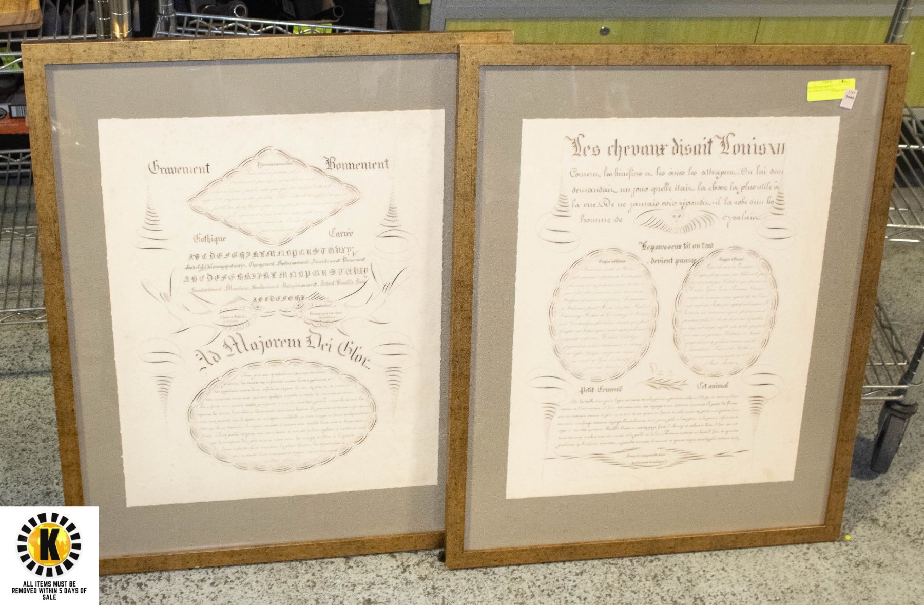 TWO FRAMED PRINTS, CALLIGRAPHY WRITTEN