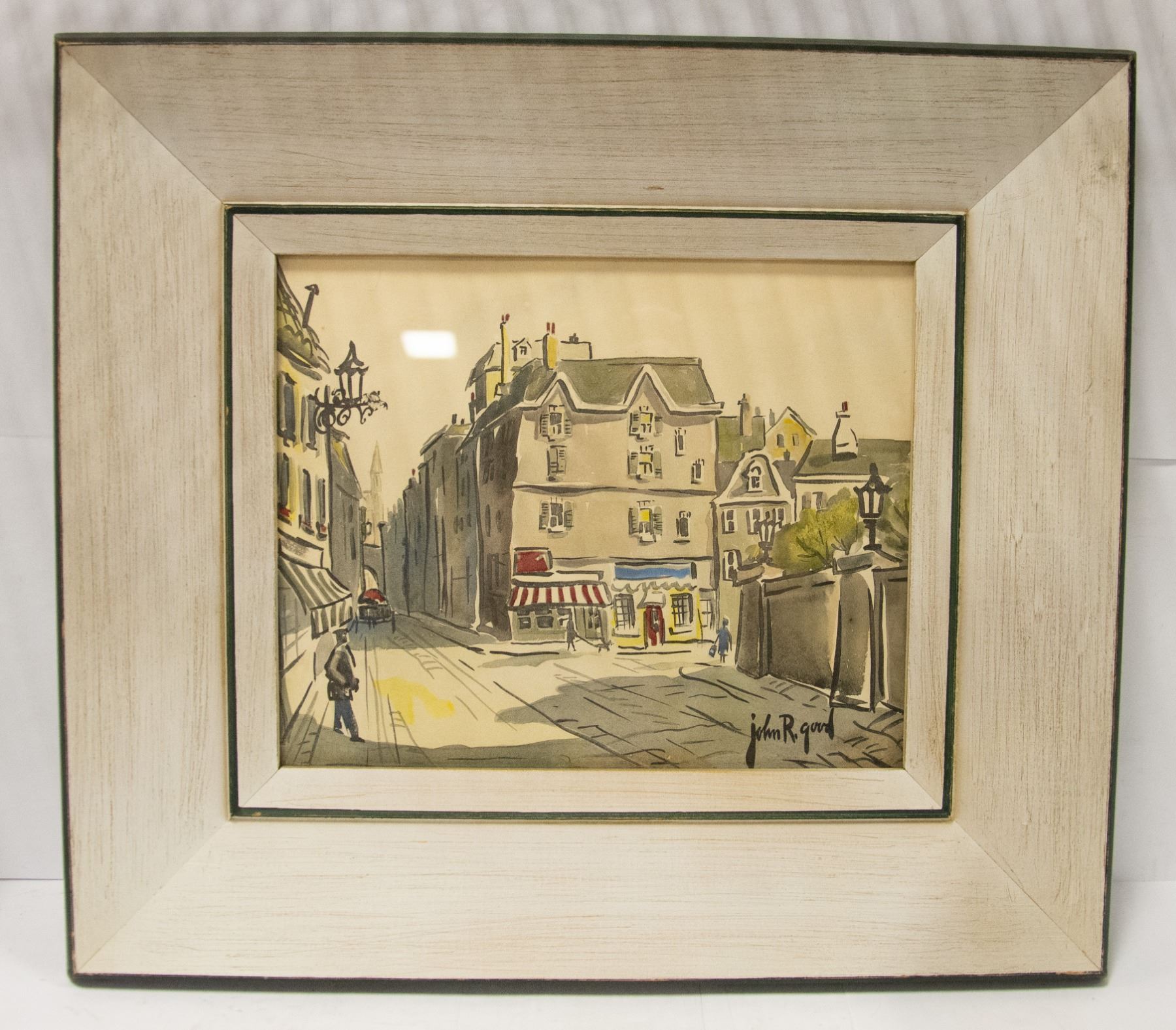 ARTIST: JOHN R. GOOD. COLOURFUL STREET SCENES, 1940S. 15" X 17"