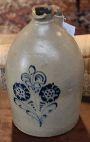"TWO GALLON STONEWARE JUG with with spout, floral decoration 19th century, large chip at spout "
