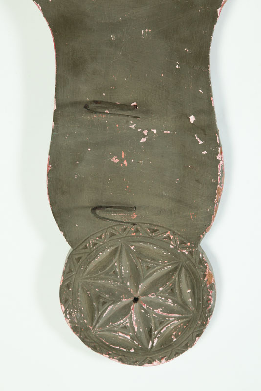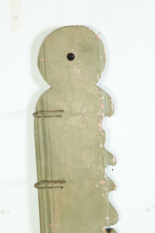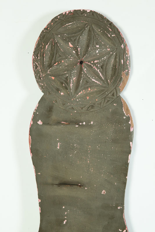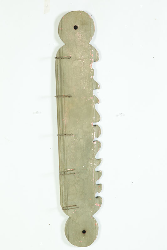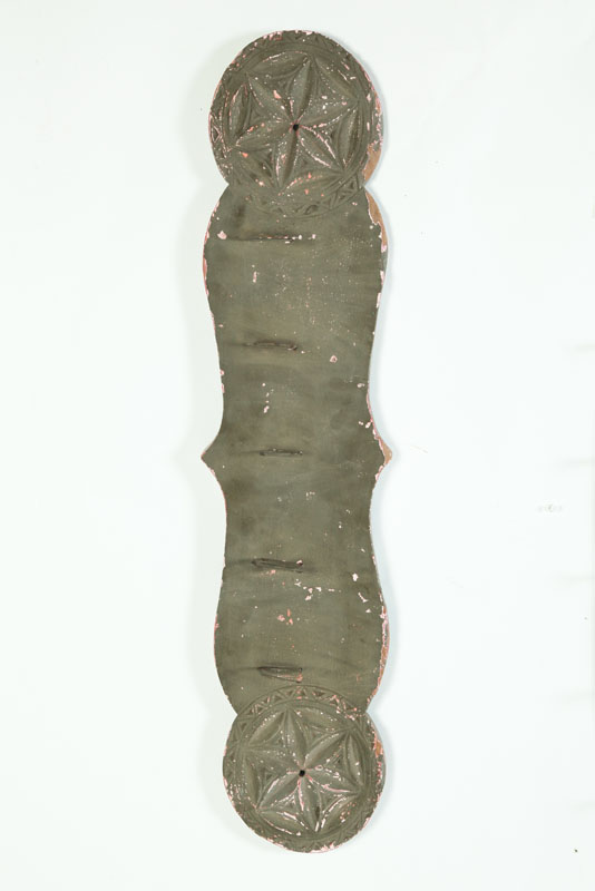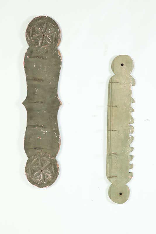 Twentieth century, softwood. Both with lollipop ends, the larger with chip-carved pinwheels. Distressed paint and wrought-iron hooks. 35 1/2"l. and 31 1/2"l.