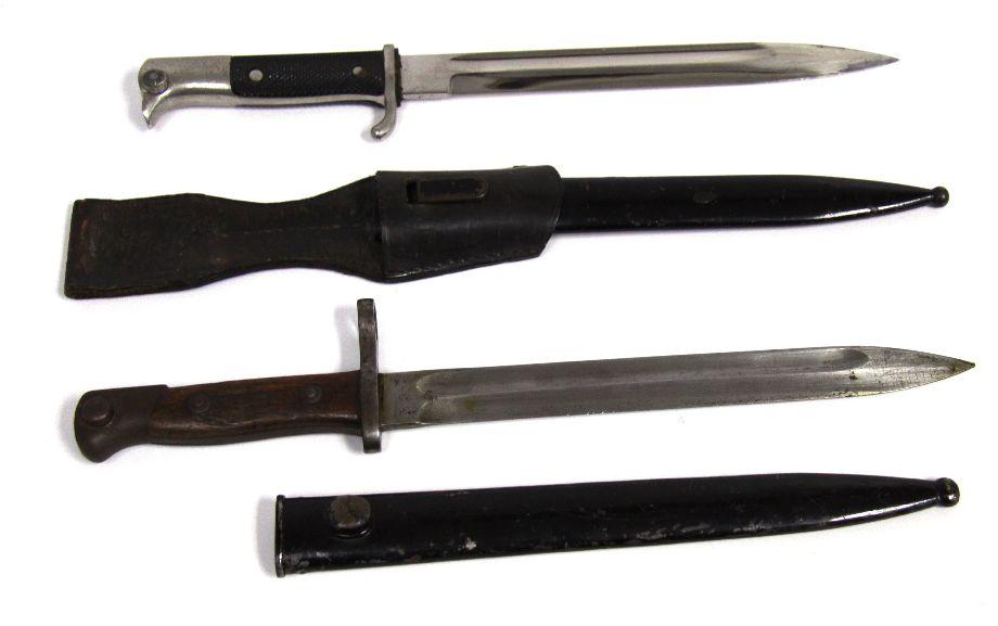 Two bayonets. A German Model 1939 short dress bayonet, with scabbard and frog. Also, a Model 1871/84 Mauser knife bayonet, with scabbard, marked Weyersburg, Kirschbaum & Co., Solingen. Both in good condition.