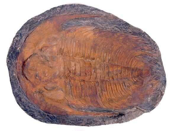 TWO GIGANTIC TRILOBITES. This lot consists of both the positive and negative slabs of Acadoparadoxites, one of the largest and one of the very earliest trilobites that ever lived. It is very rare to collect both the positive and negative slabs as most specimens only contain the positive when the rock is split. This gigantic trilobite was one of the largest predators of the mid Cambrian warm seas of Morocco. Found in the Atlas Mountain range of Morocco, this 14 x 10 inch trilobite has an attractive rust orange color, limonite (an iron oxide) which nicely contrasts the grayish brown matrix. Both parts are virtually complete with only minor restoration of a few of the spines on the pygidiums. With most trilobites being only an inch or so in length, finding a museum quality specimen of a giant trilobite is a very rare occurrence.