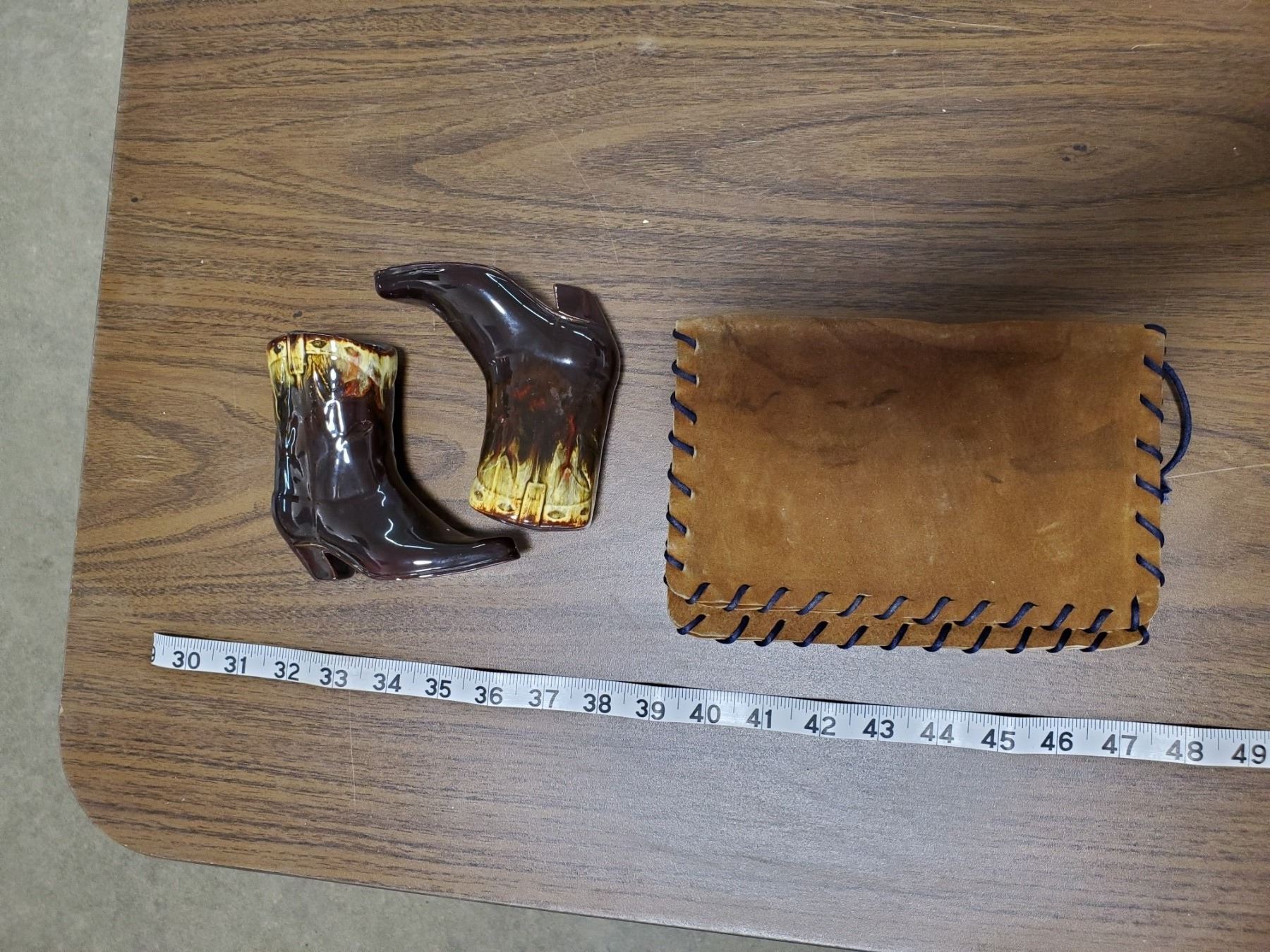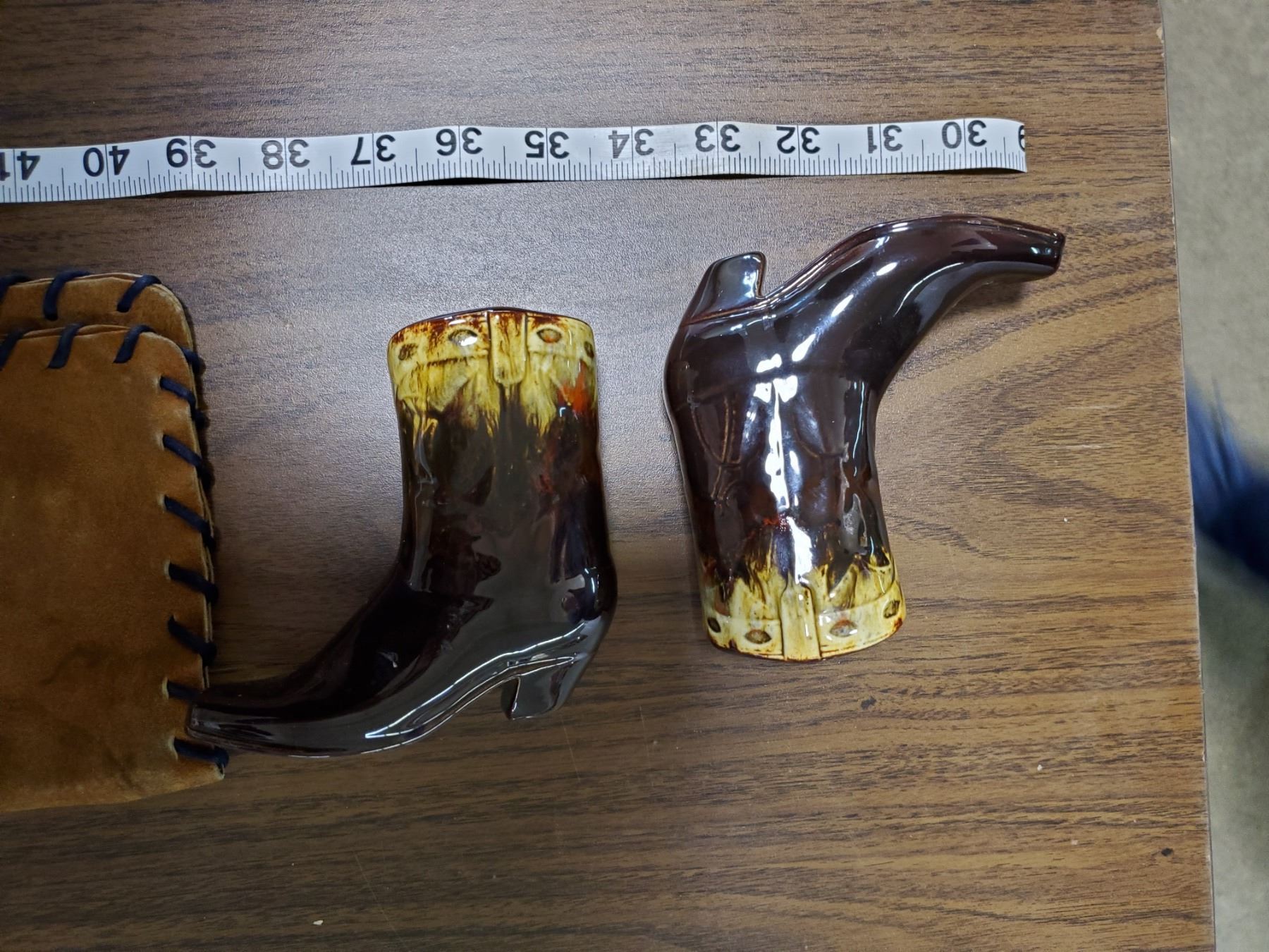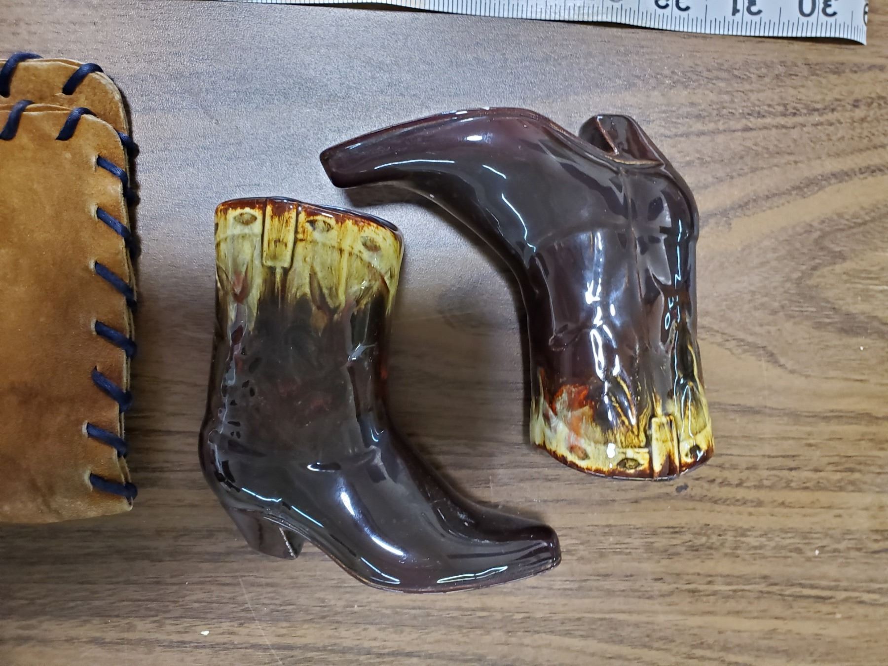 TWO GLASS COWBOY BOOTS & HANDMADE LEATHER POUCH