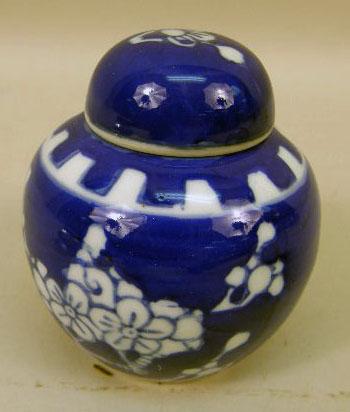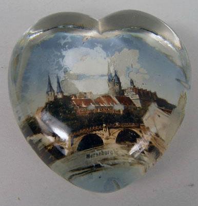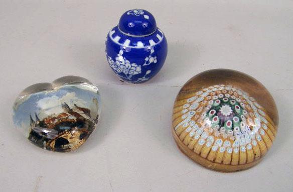 The first an apricot-colored millefiori, the second a heart-shaped souvenir from Merseburg, Germany. Together with a small blue-and-white Chinese ginger jar. 3 pieces. The Merseburg image flaking away from the back.