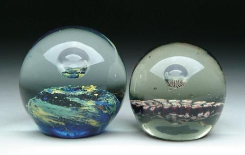 TWO GLASS PAPERWEIGHTS. Lot consists of a red, white and blue millifiori paperweight with an internal bubble. The second weight is a yellow, blue and green planet weight with an internal bubble. SIZE: 3 in. and 3-1/2 in. dia. respectively. CONDITION: Very good to excellent. Collection of Johanna and Sean Billings 5-60993