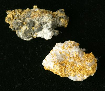 TWO GOLD SPECIMENS FROM CALIFORNIA. These two pieces weigh 1.45 ounces. Both have some quartz, and one has a bit of crystalline galena. These specimens have a measured specific gravity of 5.1 (36.6 grams in water and 45.4 grams dry weight) with a calculated gold content of 0.87 troy ounces.