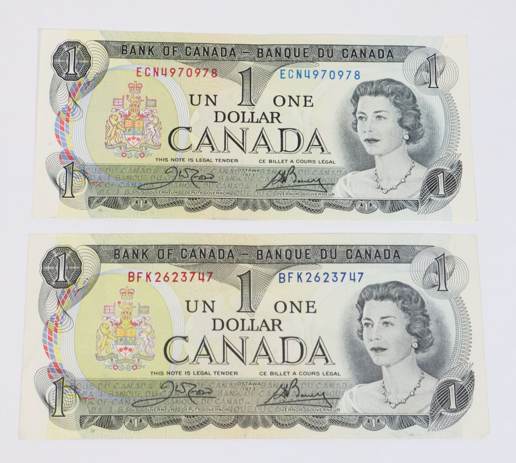TWO GOOD CONDITION 1973 CANADIAN ONE DOLLAR NOTES