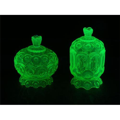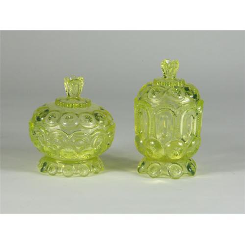 Two green vaseline glass jars/compotes with lids, pressed glass. The first measures 8.25'' x 4.5''. The second measures 7'' x 5.5'', hallmark ''M'', on underside.