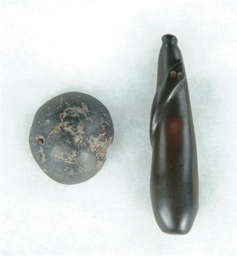 TWO HEMATITE ARTIFACTS. Early Woodland, Circa 1000BC style-100AD style. 1) Plummet with snake effigy. SIZE: 4in. x 1in.. CONDITION: Very good. 2) Cone. SIZE: 2in. x 1-7/8in.. CONDITION: Fair to good condition. 9-25984-147 The Tennessee Collection of Prehistoric Indian Artifacts from the Allen Graves Estate. SPECIAL NOTE: We do not regularly sell Prehistoric Indian stone artifacts and therefore have very little experience and no expertise in this area. All of the following lots have come from the Collection of the Late Allen Graves of Tennessee. The collection was inherited some years back by his daughter, who now lives in Maine. This collection was consigned to us directly from her. We employed someone to generally identify styles and types, but as stated above, due to our lack of expertise in this field, we can not guarantee the age or origin of the following pieces. We are relying on you, the buyer, to determine to your satisfaction the origin and age of each item in the collection.