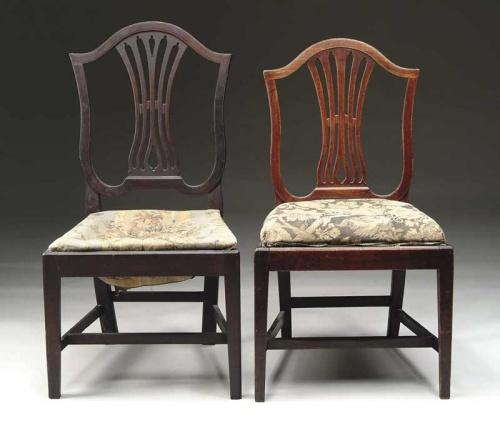 TWO HEPPLEWHITE DINING CHAIRS. Both appear to be in mahogany and are similar but not exact. Tapered front legs, a molded seat rail edge and rectangular stretchers. Out-sweeping back legs. SIZE: 39” h and 37” h. CONDITION: Minor repairs and restoration. Seats as is. Otherwise very good. 9-26576