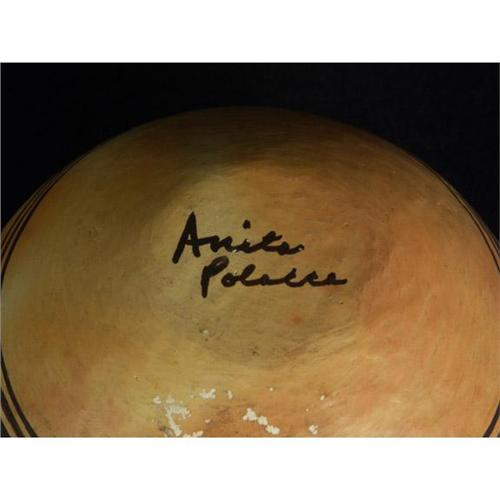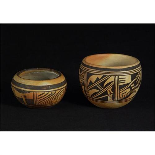 HOPI POTTERY: Two Hopi pottery vessels. The first has a circular banded abstract design on an ochre ground, 3 1/4''H x 4 1/2'' diameter, some paint losses and crazing noted. The second piece is a slightly larger vessel also with a banded abstract design on an ochre ground, signed ''Anita Polacca'', 4''H x 5'' diameter, some paint losses noted.