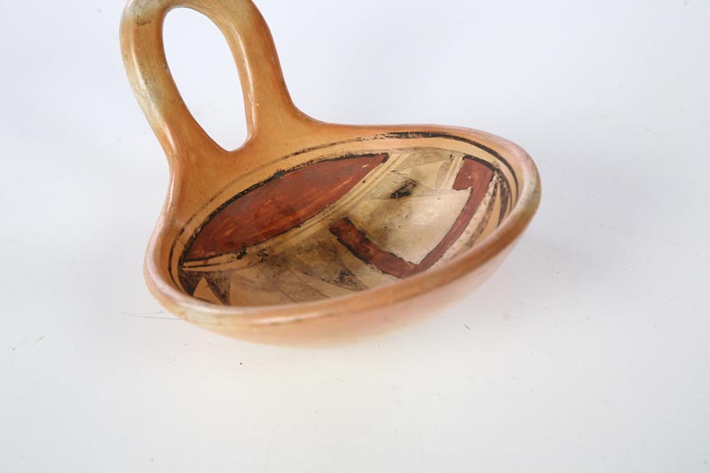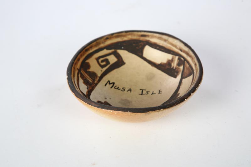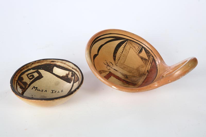 Twentieth century. Ladle signed "Laura Tomasi" (active 1930-1968). Design has wear. 6"d. And a small bowl labeled in marker "Musa Isle", 5"d.